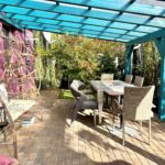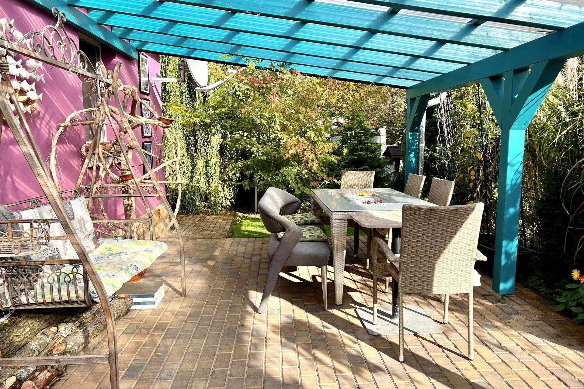 Das Grundstück ist komplett eingezäunt und bietet außerdem noch befestigte Stellplätze, einen Garten und eine große überdachte Terrasse.
