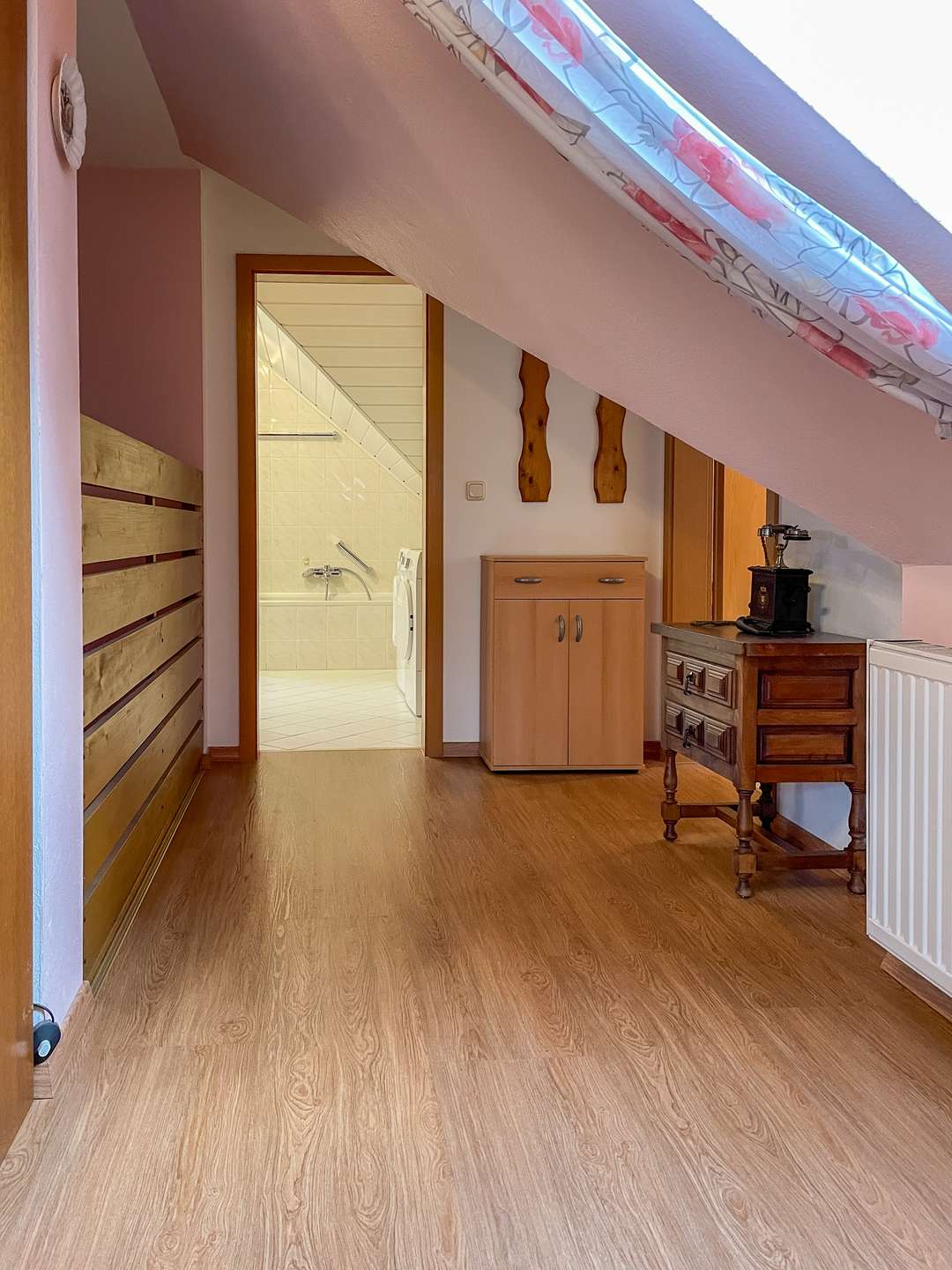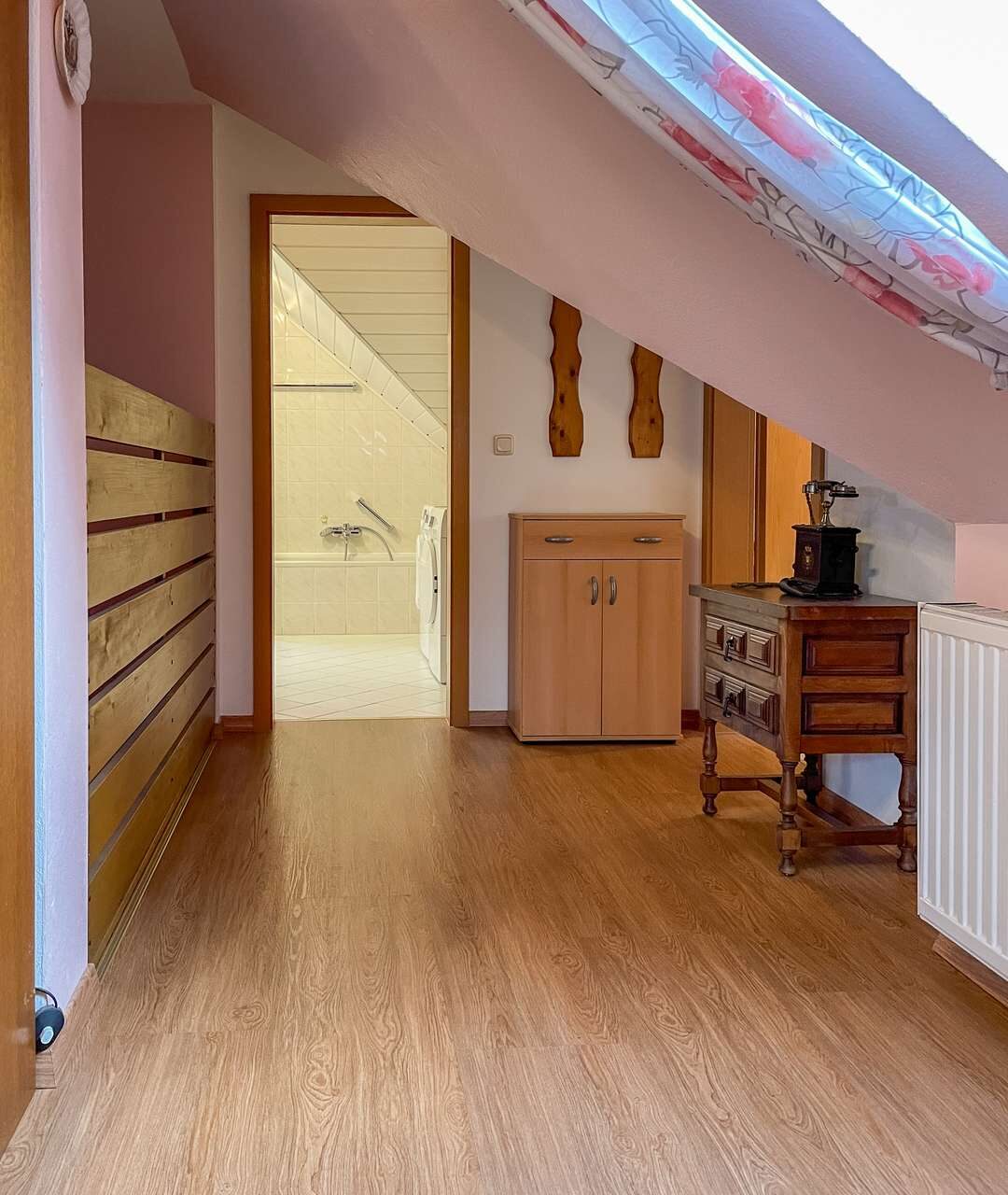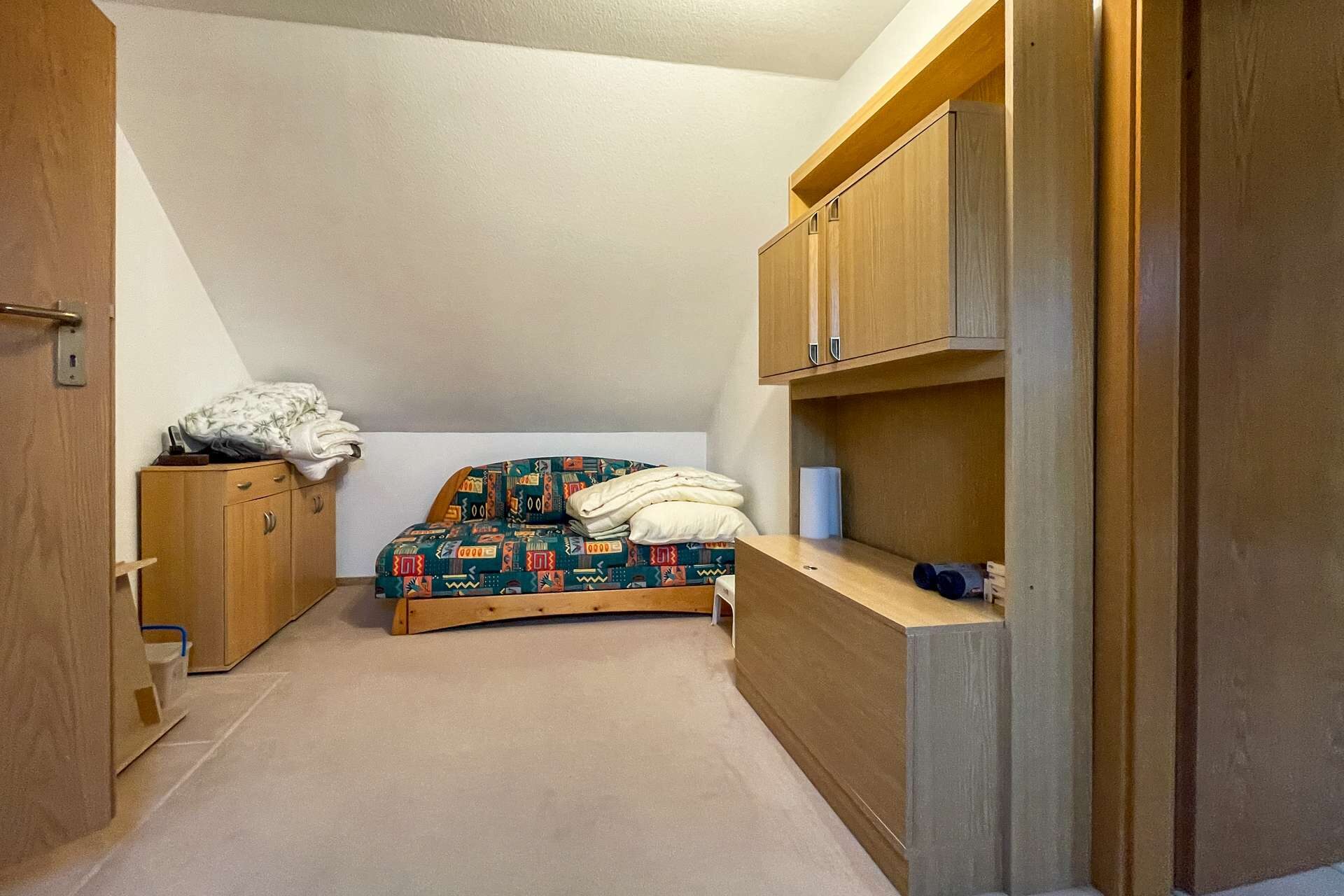 Im Obergeschoss erwartet Sie ein lichtdurchflutetes Wohnzimmer, das sich ideal als Rückzugsort eignet und den Zugang zum Balkon gewährt. Zwei geräumige Schlafzimmer bieten ausreichend Platz für individuelle Gestaltungsmöglichkeiten – sei es als Kinderzimmer, Gästezimmer oder Home-Office. Das Badezimmer ist ein wahres Highlight: Es verfügt über eine Dusche, eine Badewanne und Tageslicht, was für eine angenehme Atmosphäre sorgt. Zusätzlich gibt es einen Abstellraum, der weiteren Stauraum bietet.