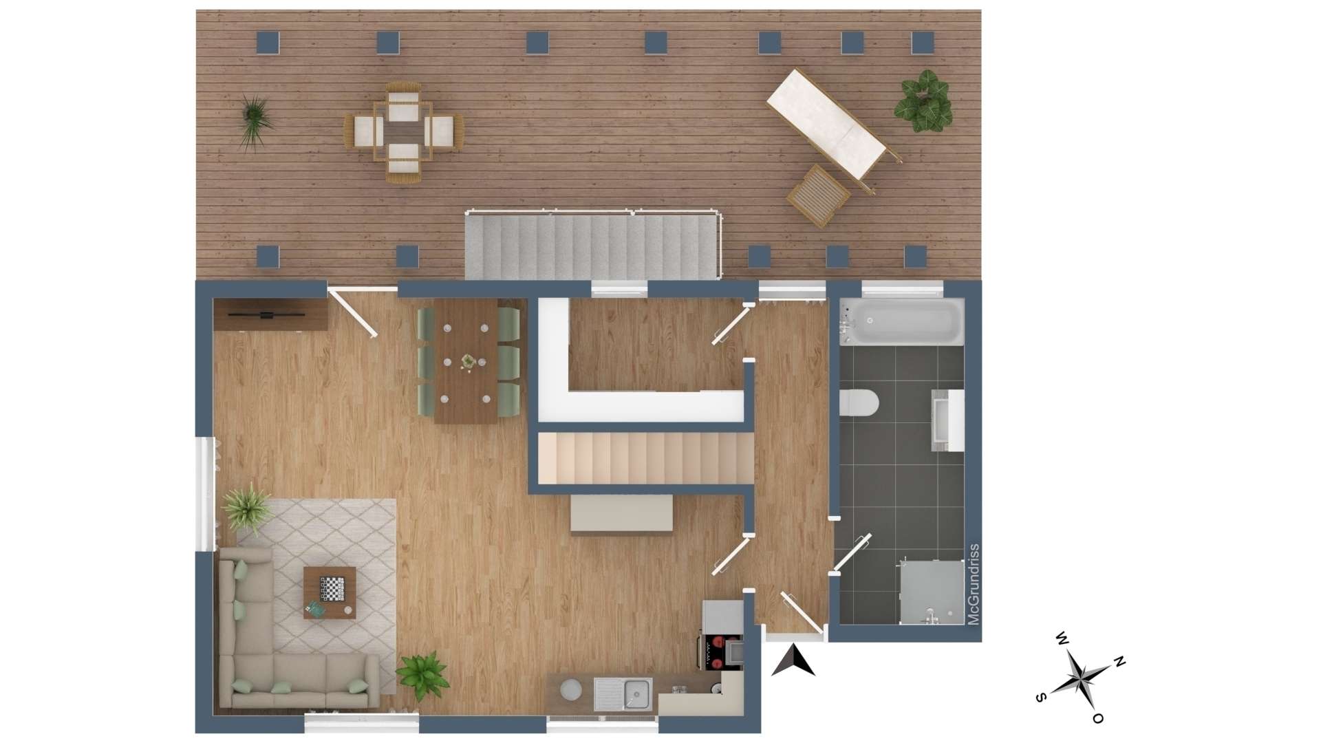 Im Erdgeschoss befindet sich eine großzügige offene Küche mit Wohn – und Essbereich, der Raum ist L-förmig angelegt, dadurch bekommen die einzelnen Bereiche eine Abgeschlossenheit. Vom Wohnbereich gelangen Sie auf die überdachte Terrasse auf der Rückseite des Hauses. Ebenfalls im Erdgeschoss befindet sich das moderne Badezimmer, dieses ist mit Badewanne und Dusche ausgestattet. Die Waschküche verfügt über weitere sanitäre Anschlüsse, somit kann man bei Bedarf hier ein weiteres Badezimmer einrichten. Von der Waschküche gelangen Sie zudem in den Keller.
