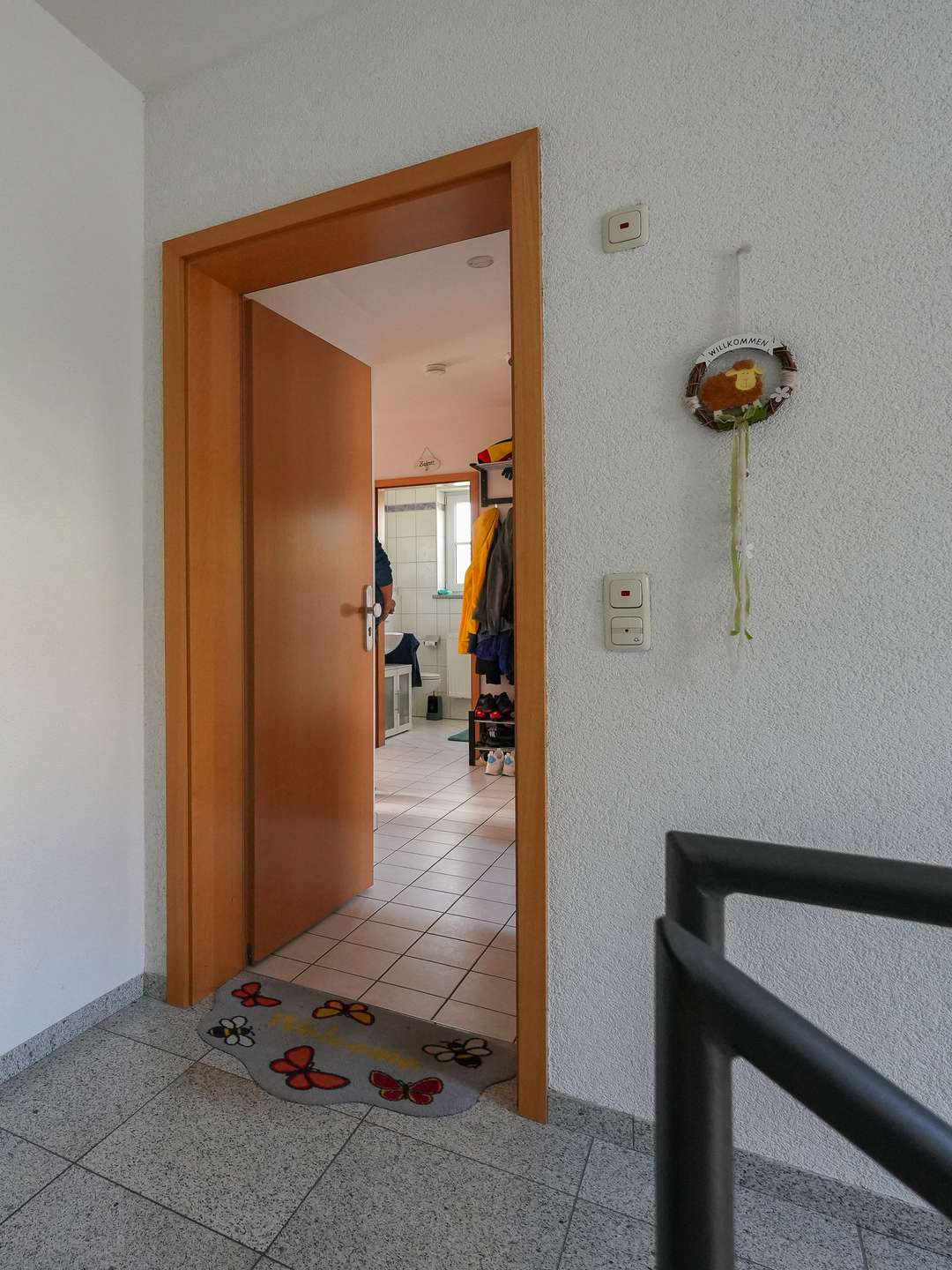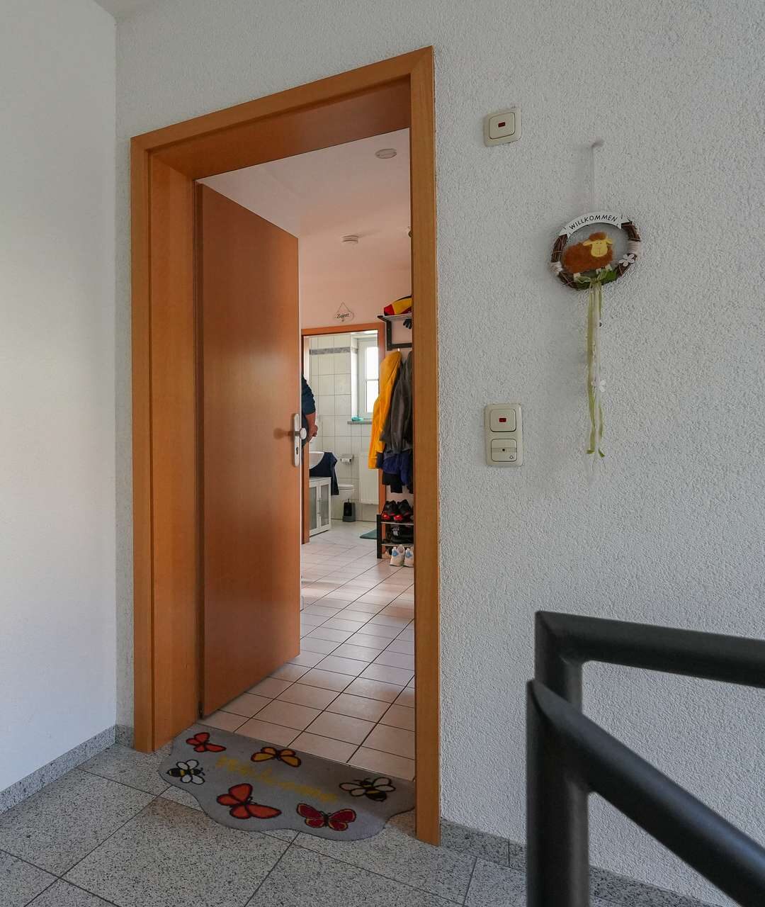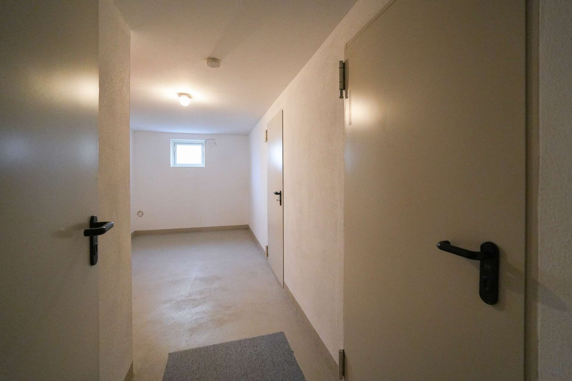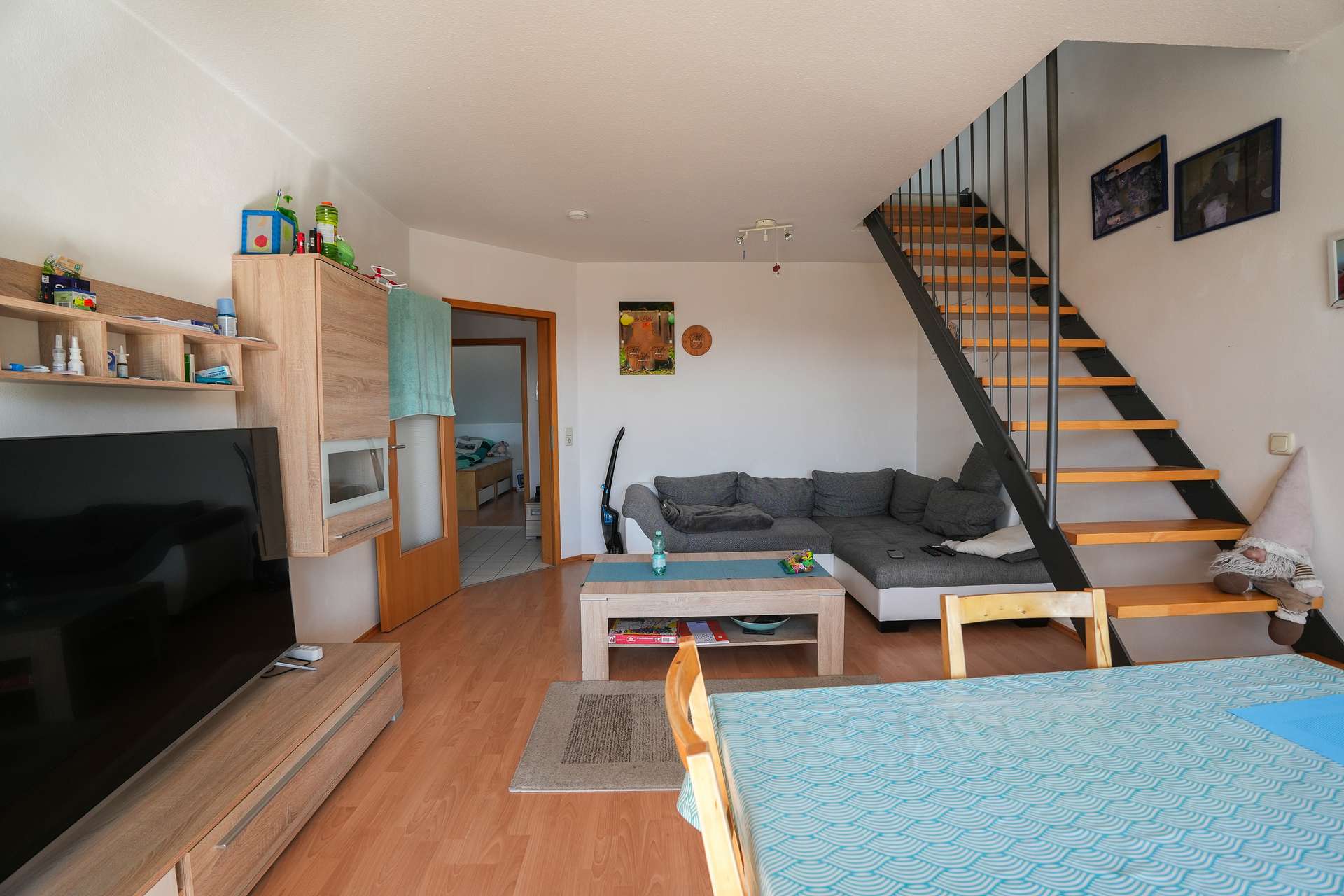 Unterschiedliche Bodenbeläge – Laminat, Teppich und Fliesen – verleihen den Räumen Struktur und ein behagliches Wohngefühl. Ein Abstellraum und ein Kellerabteil bieten praktischen Stauraum.