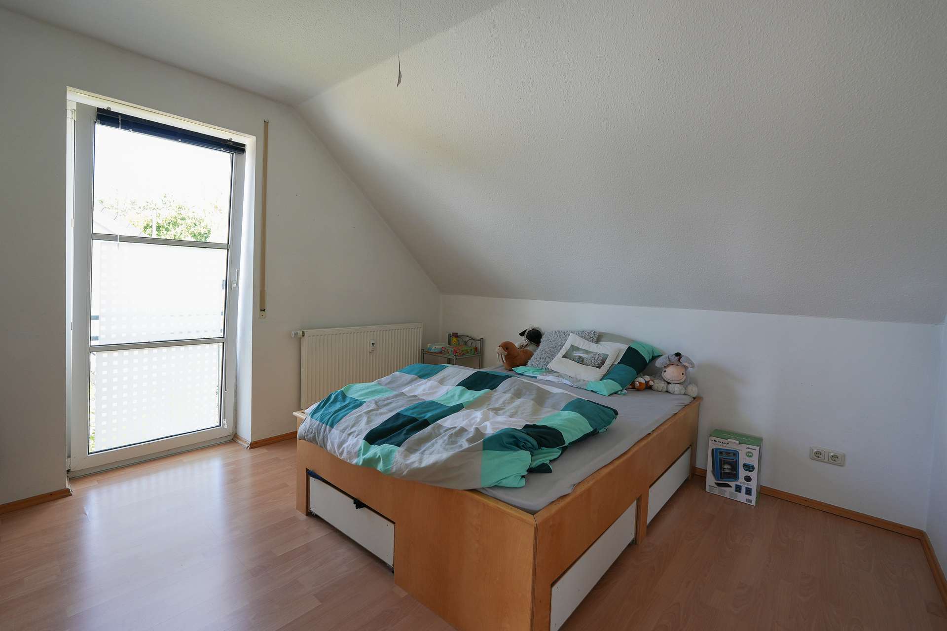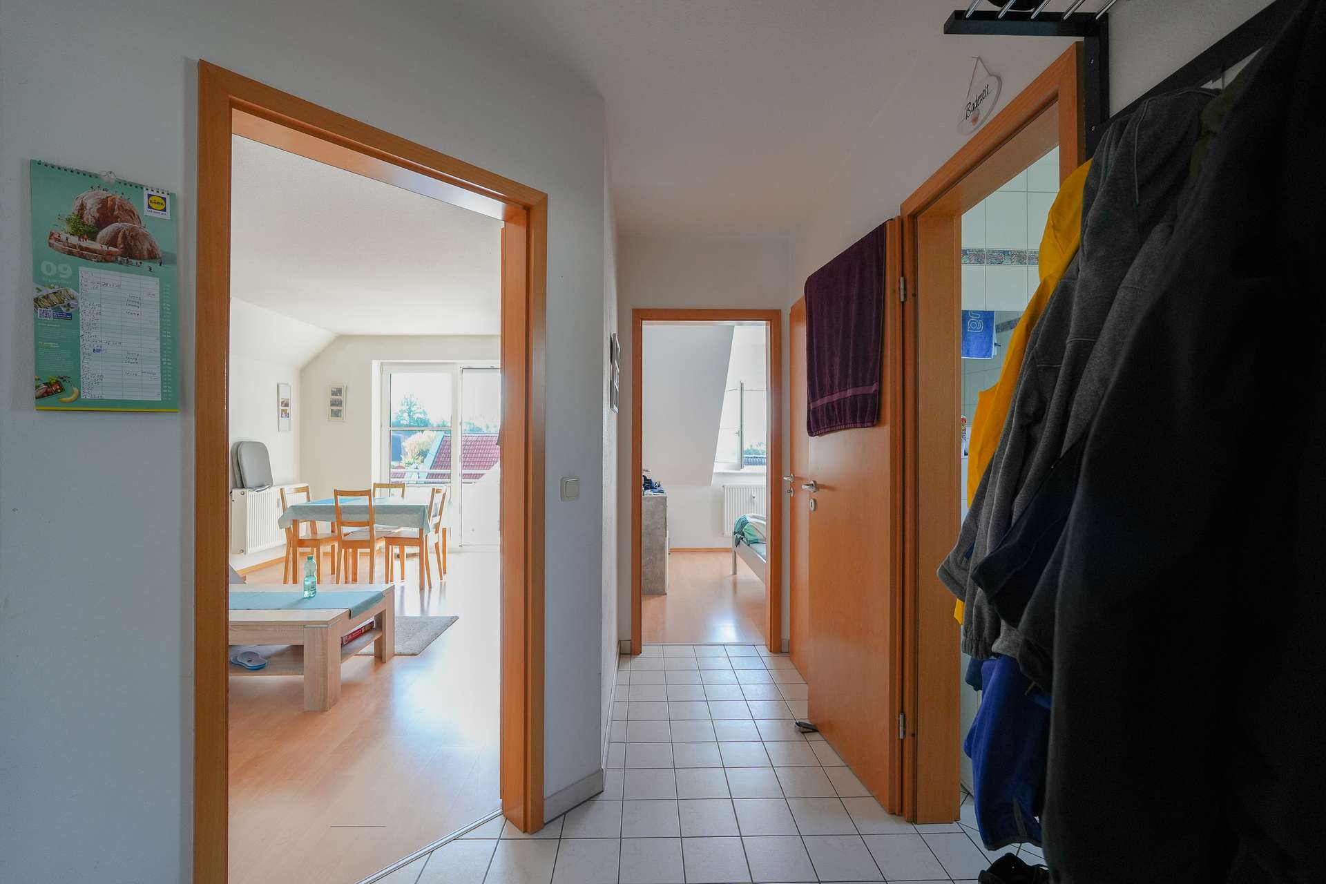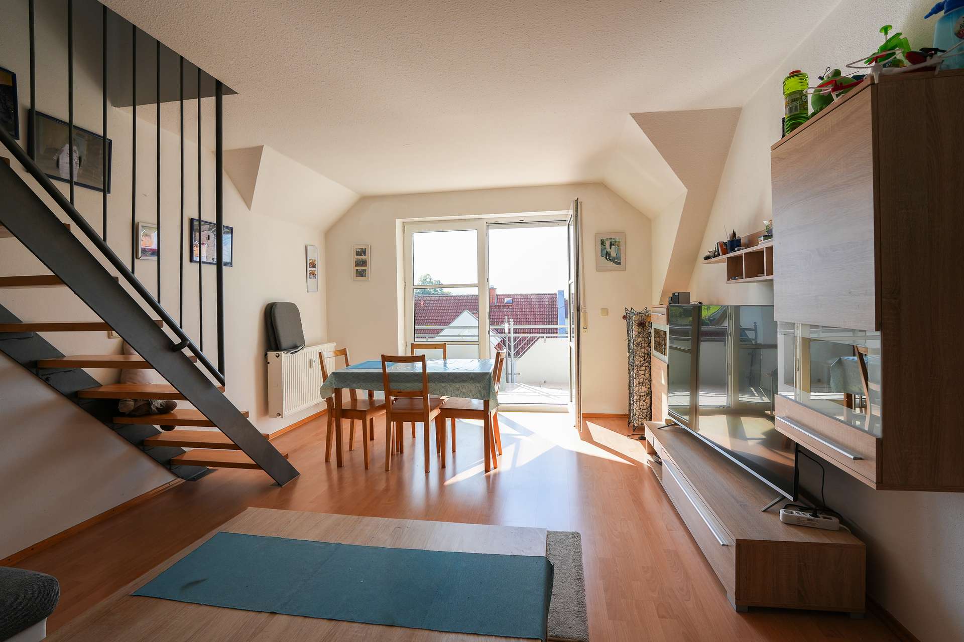 Die Wohnung erstreckt sich über zwei Ebenen im 1. Obergeschoss und Dachgeschoss eines gepflegten Mehrfamilienhauses mit insgesamt drei Etagen. Durch die offene Raumgestaltung und die großen Fensterflächen entsteht ein helles, luftiges Wohnambiente mit besonderem Charme.