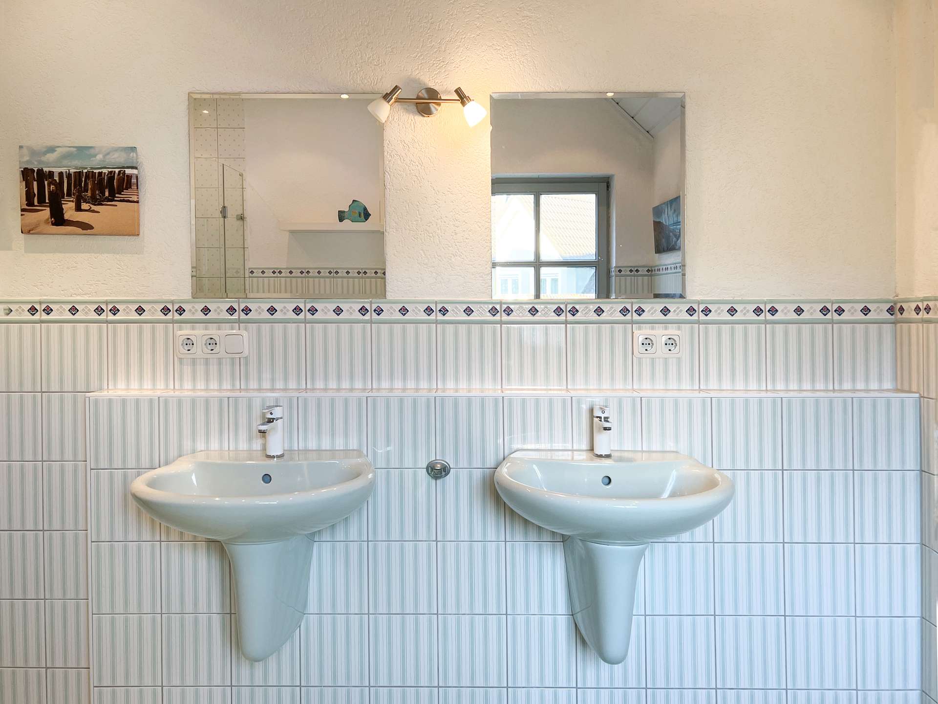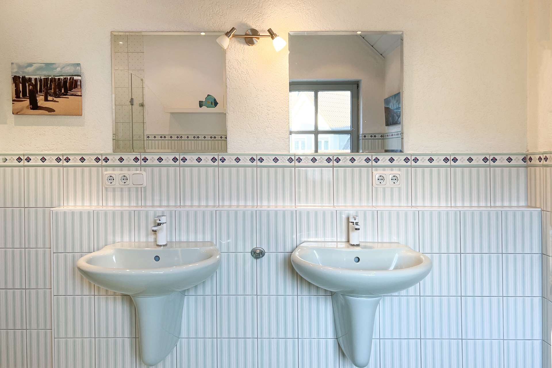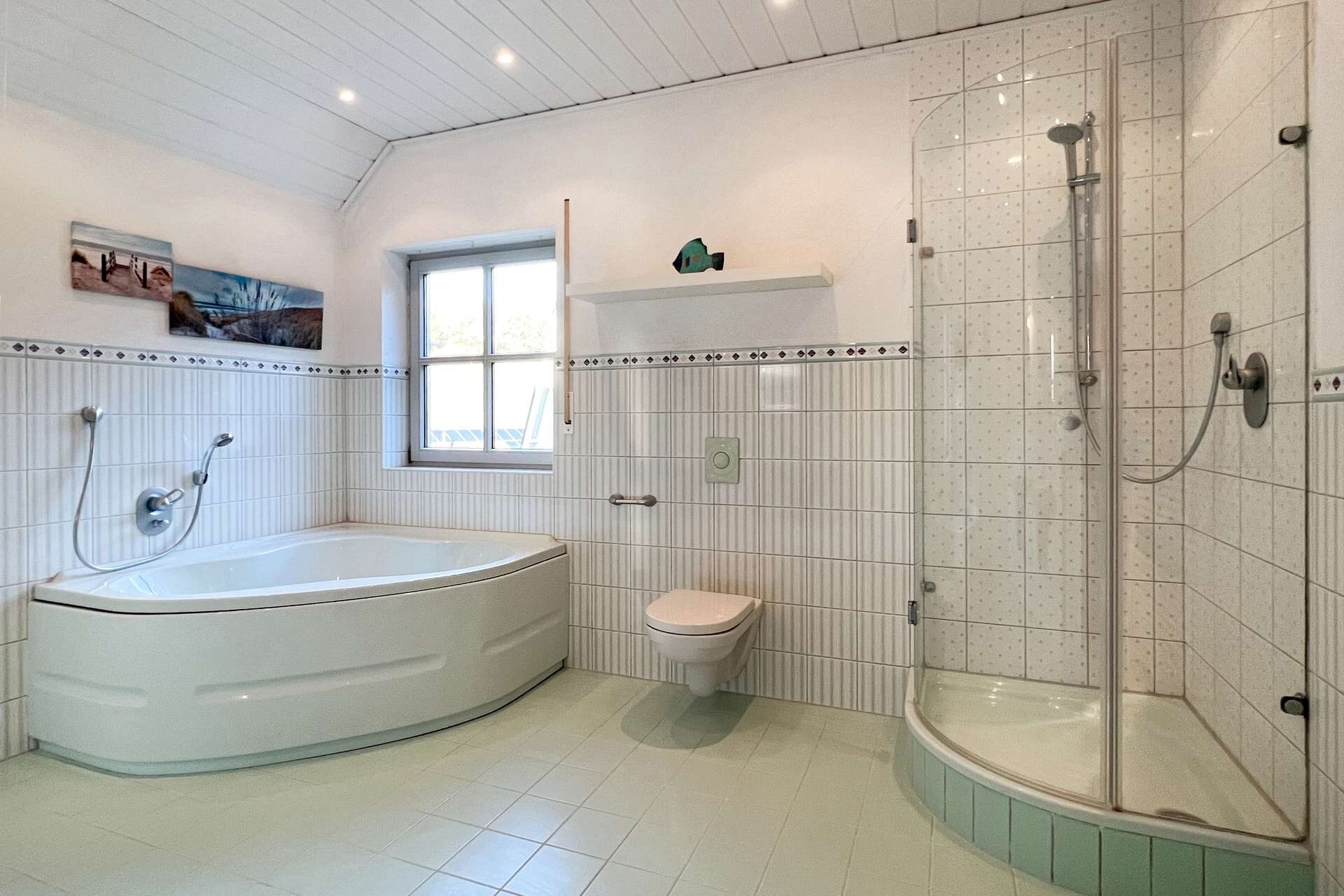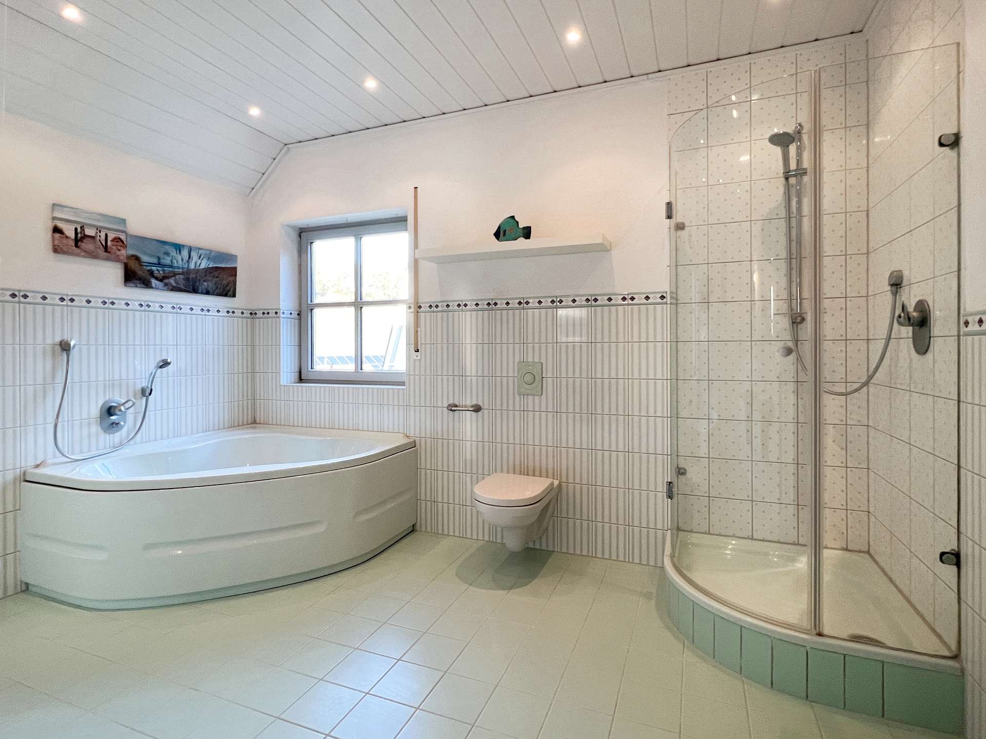 Über eine Echtholztreppe gelangen Sie in den Privatbereich des Hauses. Eine großzügige Galerie gewährt den Zugang zu allen Räumen. Das Obergeschoss verfügt über 3 lichtdurchflutete Schlafzimmer und das Hauptbadezimmer. Die Ausstattung des Badezimmers wird Sie begeistern, moderne Fliesen, eine großzügige Eckbadewanne, zwei Waschbecken, eine Dusche und Tageslicht – was will man mehr? Diese Etage verfügt außerdem über zwei Balkone, perfekt für laue Sommerabende oder gemütliche Morgenstunden in der Sonne. Die Räume lassen sich natürlich individuell nutzen, ob Schlafzimmer, Kinderzimmer oder Ankleidezimmer – es entscheiden allein Ihre persönlichen Bedürfnisse.