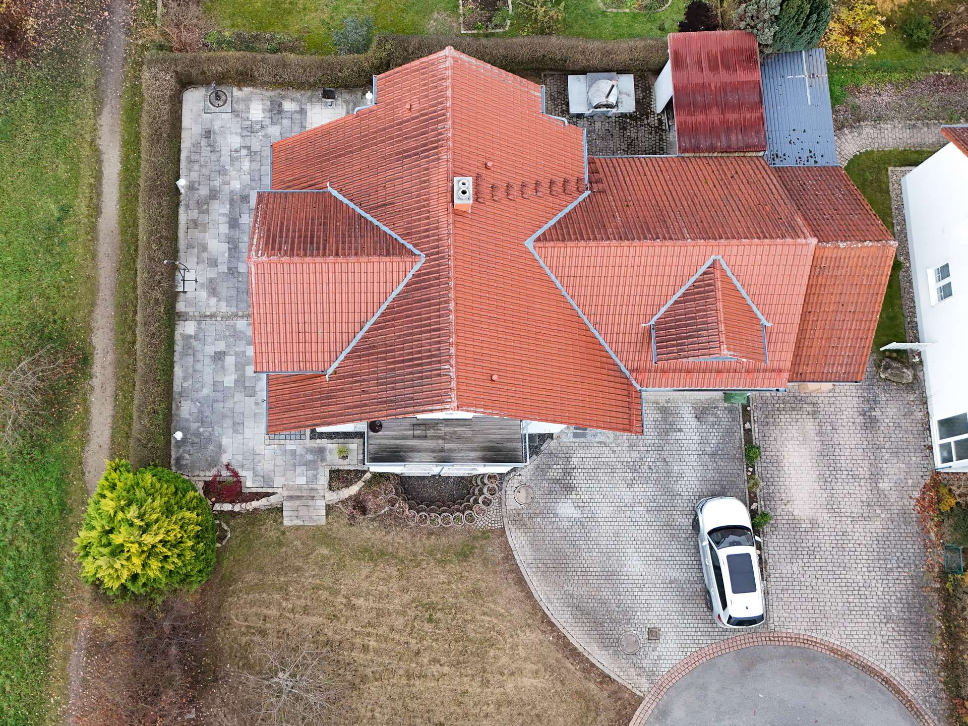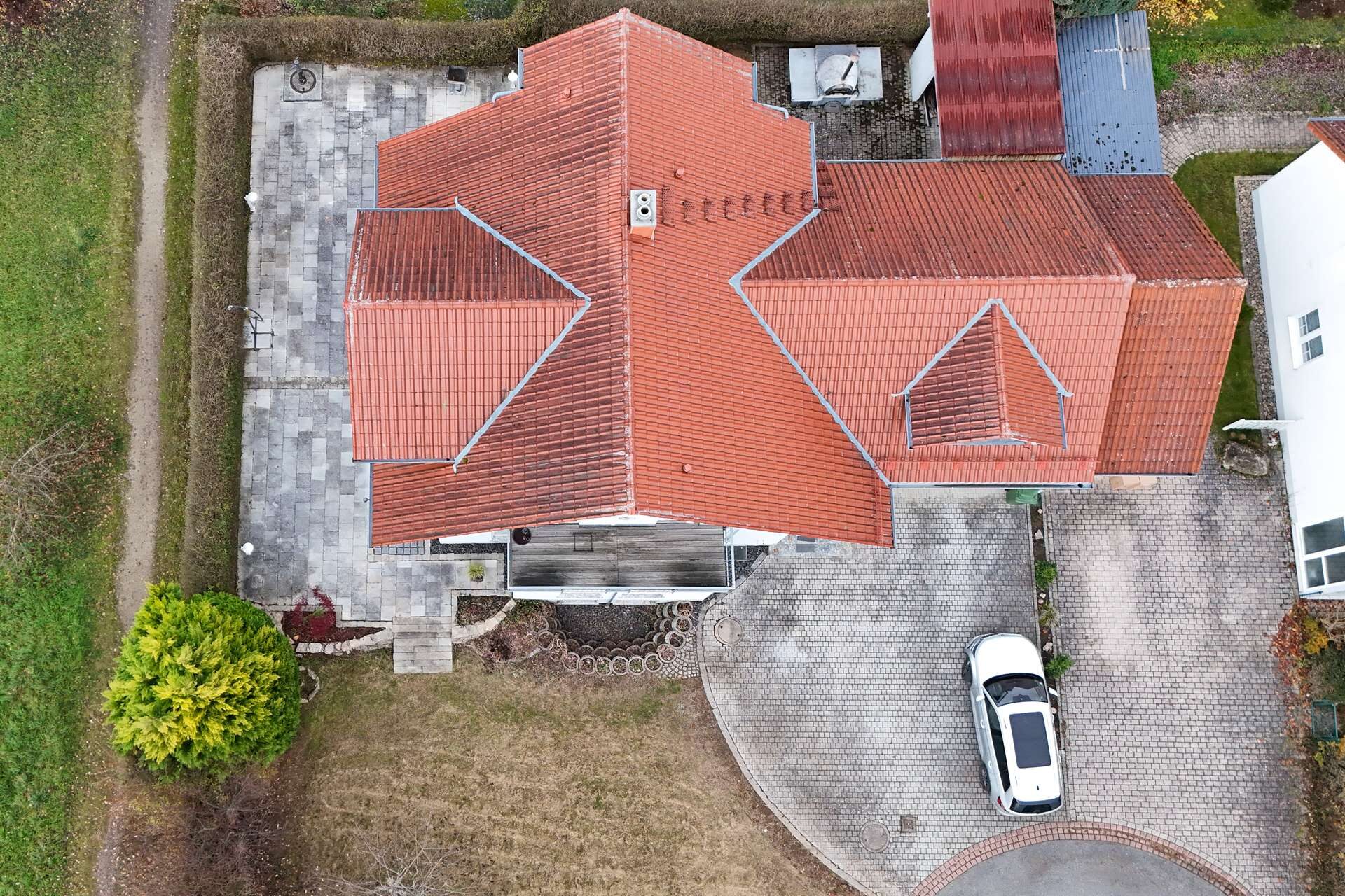 Die großzügige Terrasse bietet zudem viel Platz zum Entspannen und Verweilen und rundet den Außenbereich harmonisch ab.