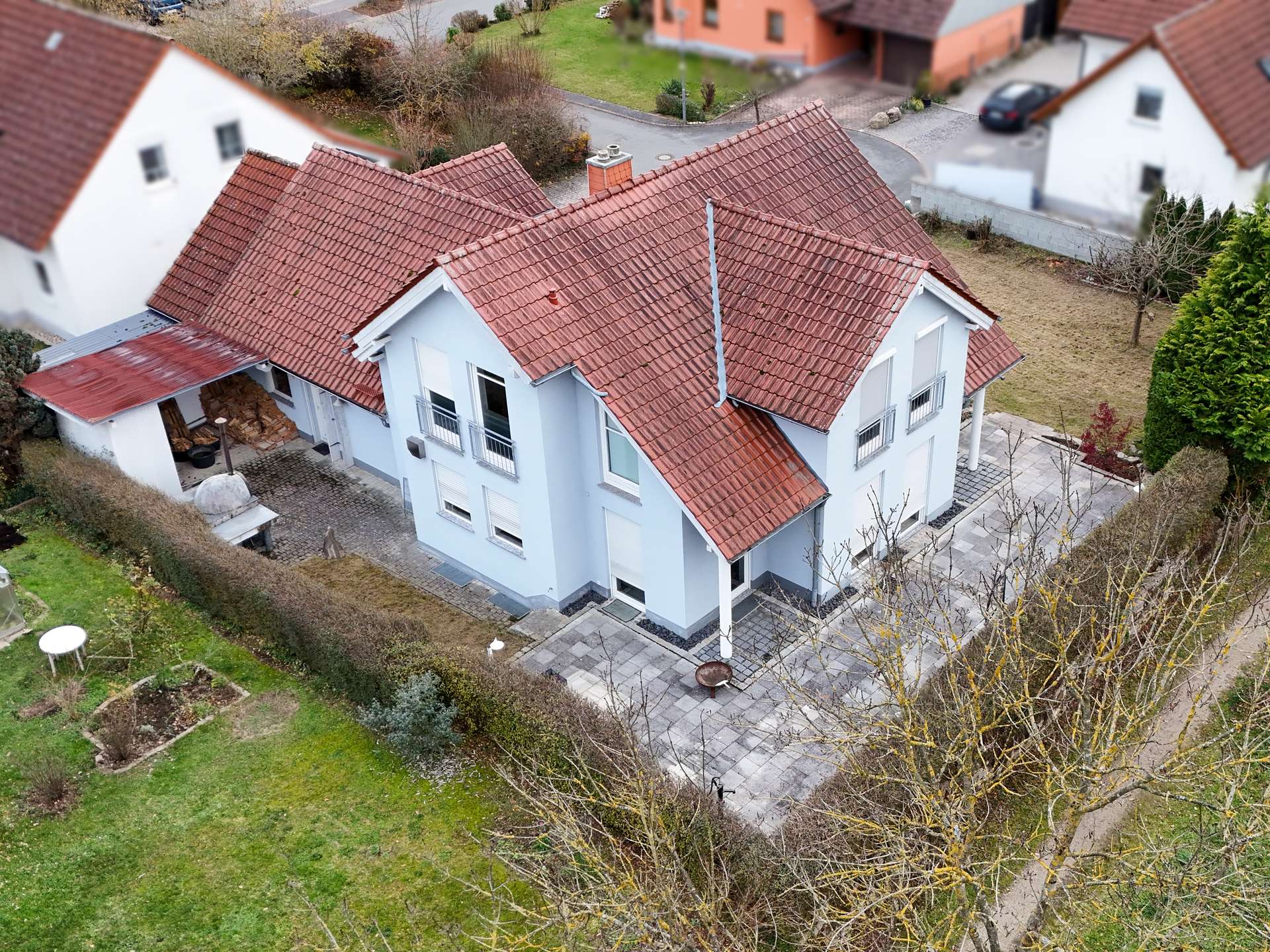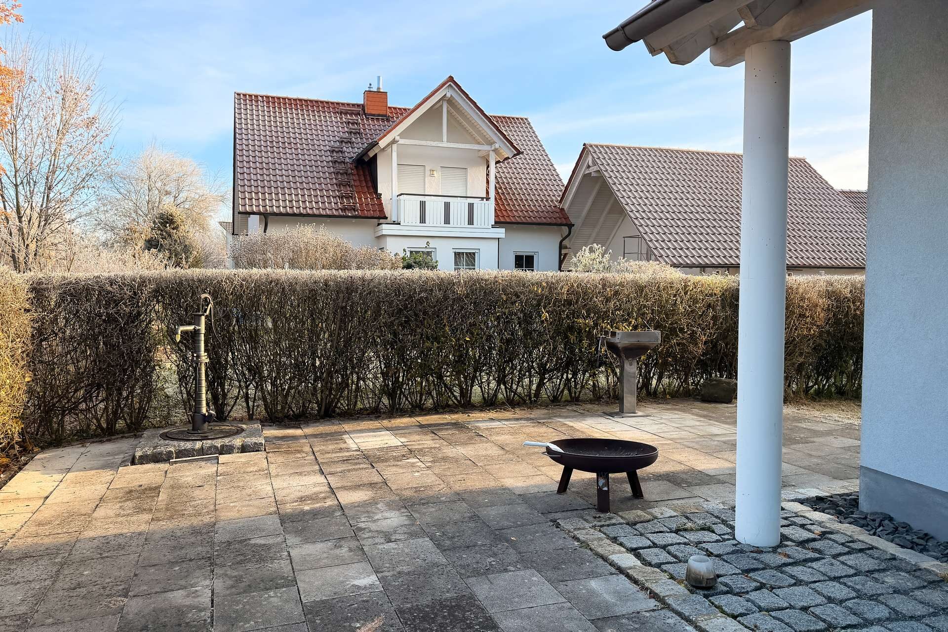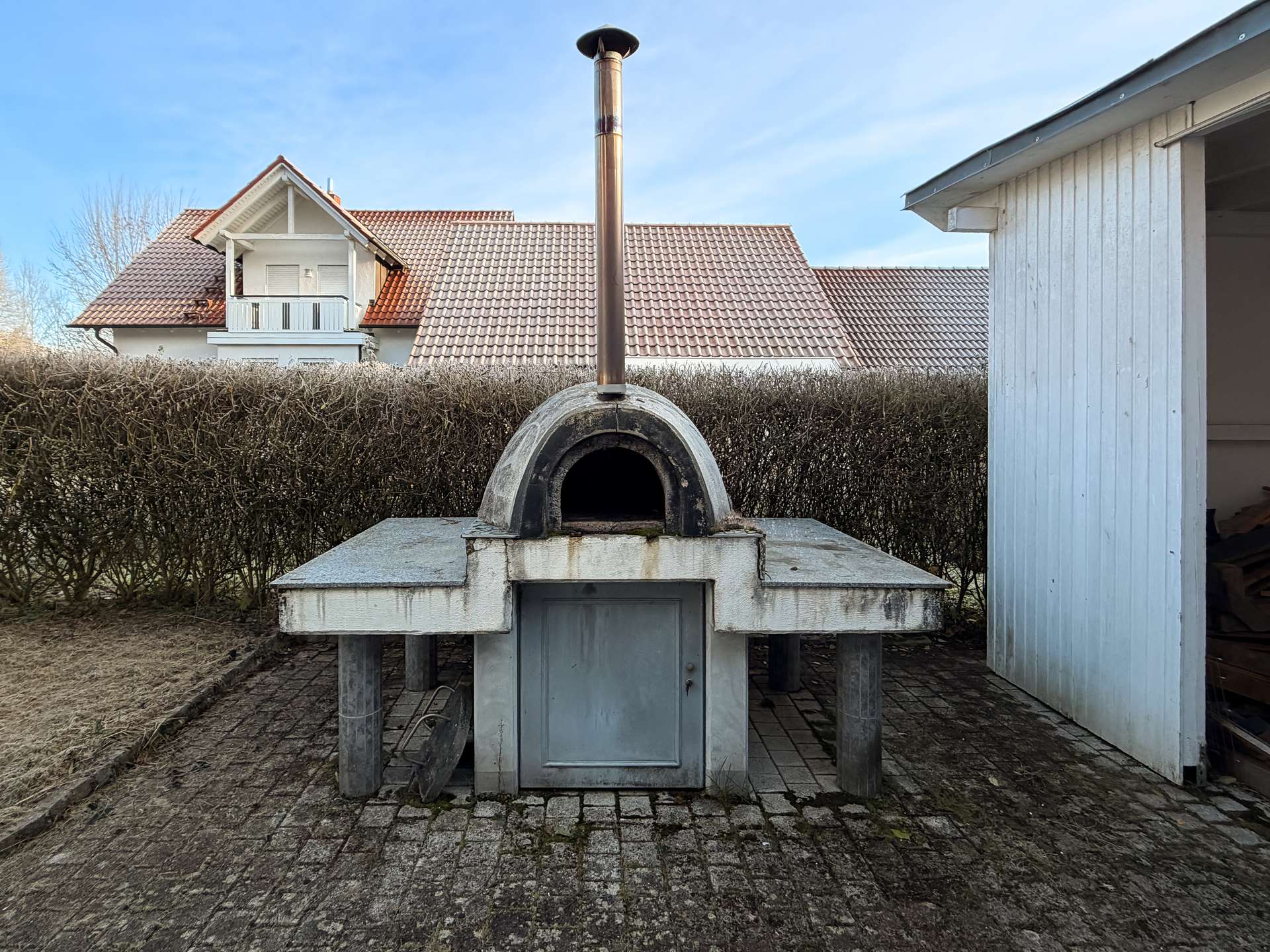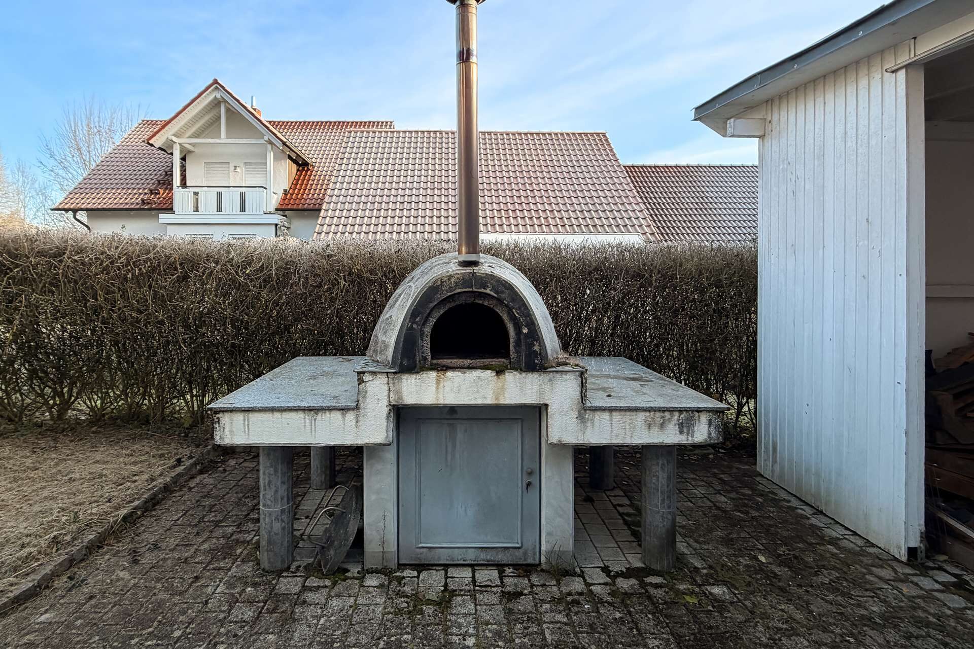 Der Außenbereich überzeugt nicht nur mit gepflegten Grünflächen, sondern auch mit einem weiteren besonderen Highlight: einem massiven Pizzaofen, der gesellige Abende im Freien zu etwas ganz Besonderem macht. Ob Pizza, Brot oder mediterrane Köstlichkeiten, dieser Ofen sorgt für ein einzigartiges Gartenambiente und lädt zum Genießen ein.