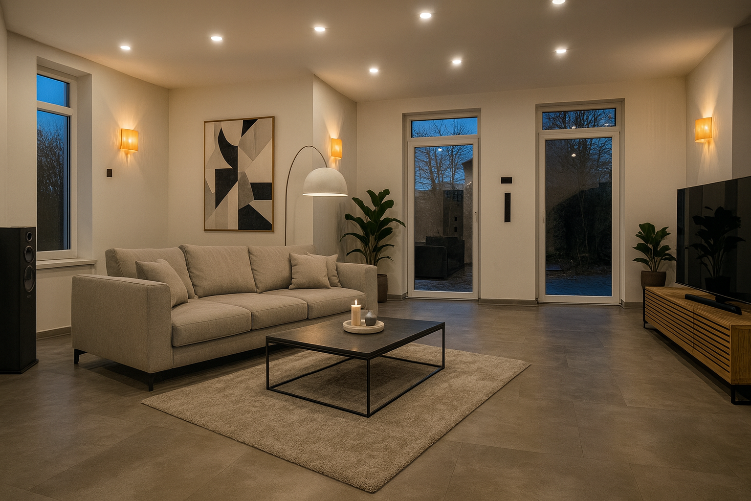 Große Fensterflächen schaffen eine helle, freundliche Atmosphäre im Ess- und Wohnbereich, während die hochwertigen Bodenbeläge und das harmonische Farbkonzept dem Raum eine luxuriöse Anmutung verleihen. Vom Wohnbereich aus genießt man einen angenehmen Blick in den Garten.
