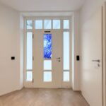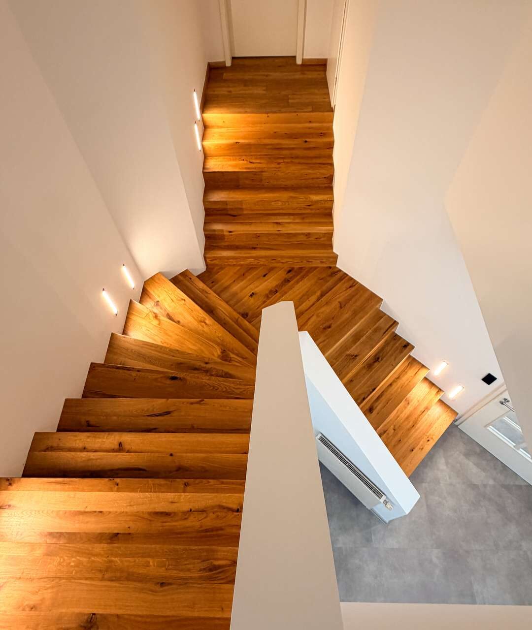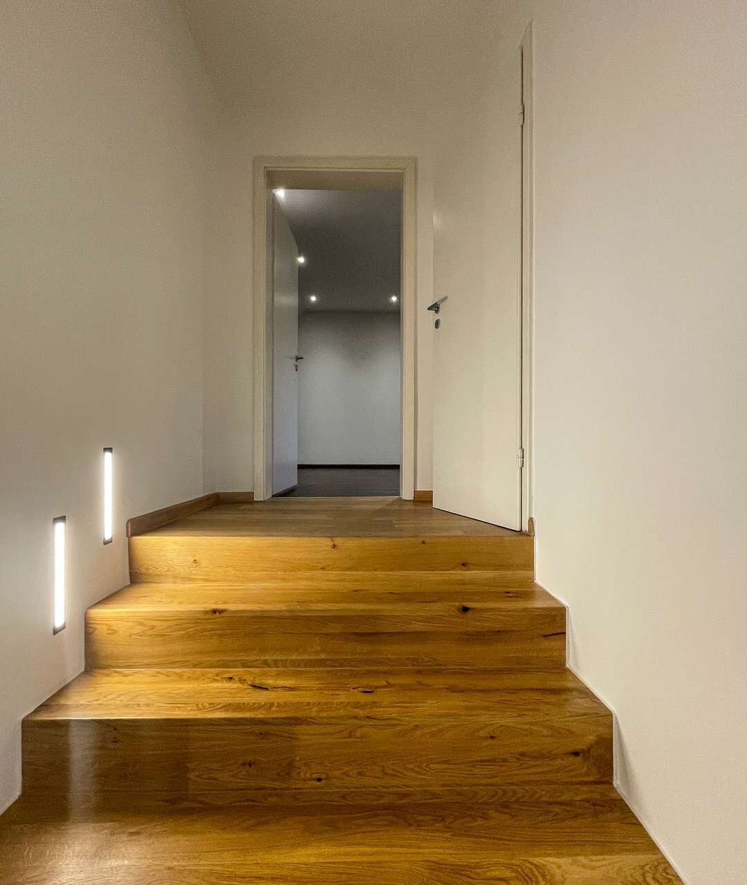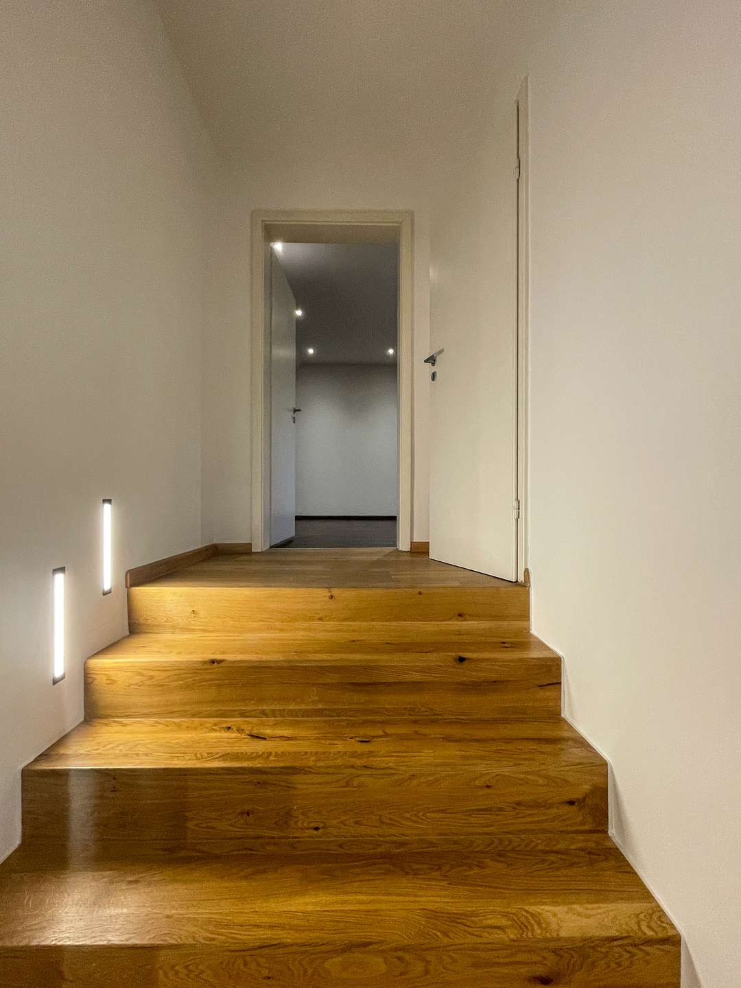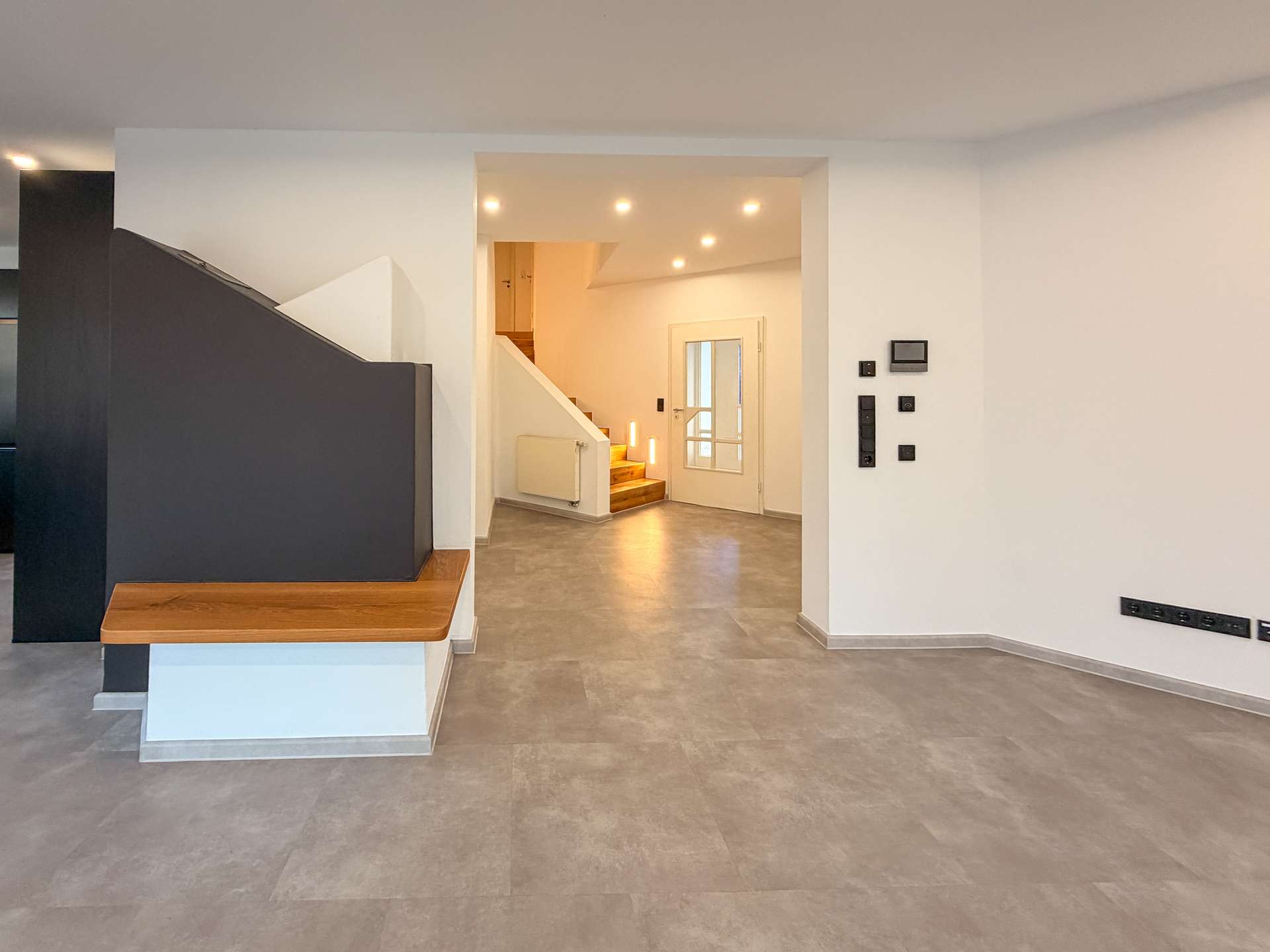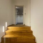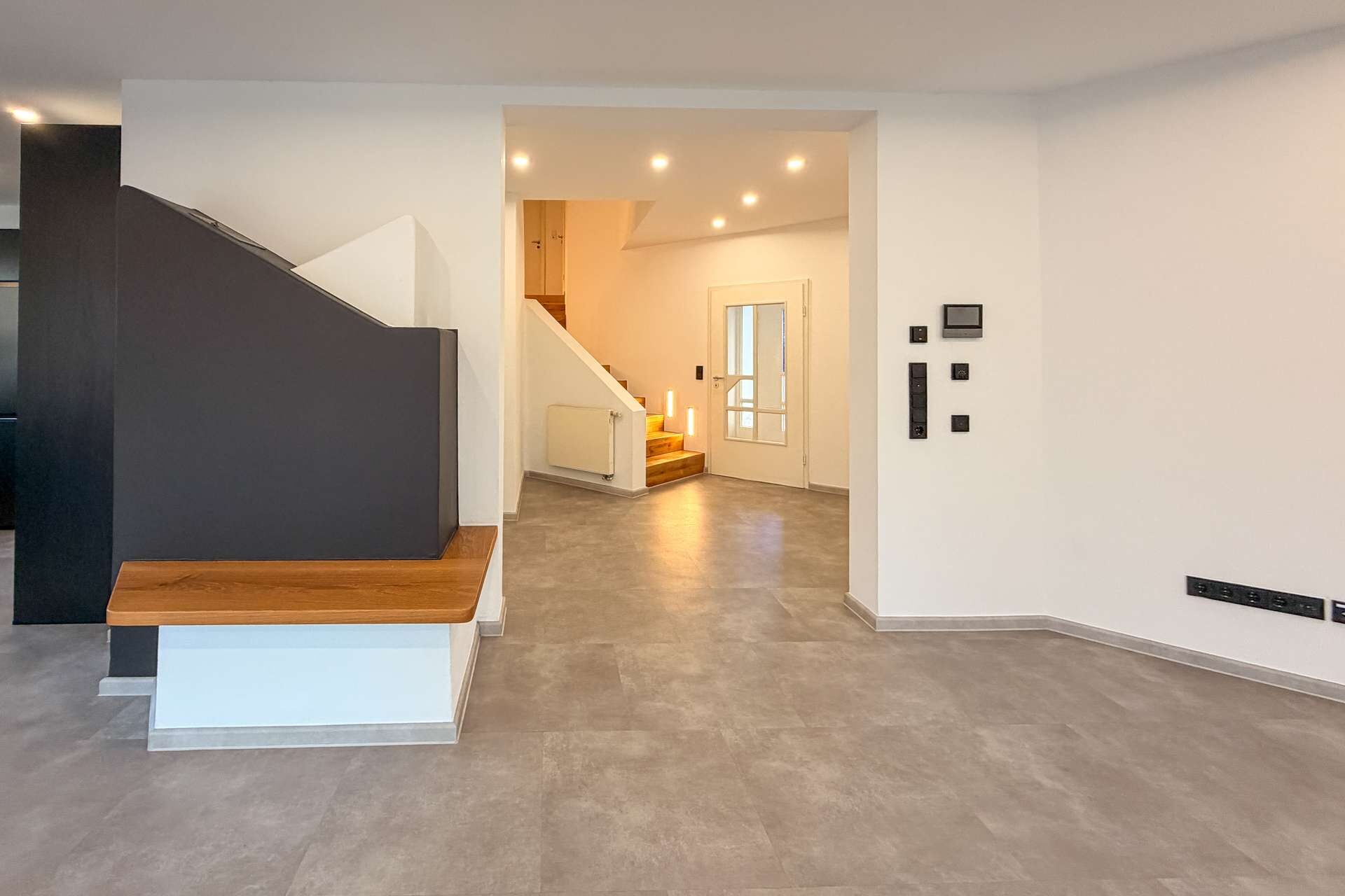 Ein besonderes Highlight ist jedoch die eindrucksvolle doppelläufige Repräsentationstreppe, die sich als zentrales Gestaltungselement über beide Ebenen zieht und die beiden Flügel des Obergeschosses miteinander verbindet. Die Kombination aus massiven Holzstufen, klaren Linien und moderner Beleuchtung verleiht dem gesamten Wohnbereich eine elegante, architektonische Note.