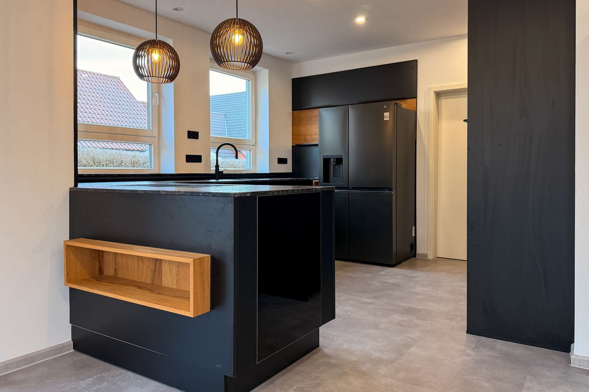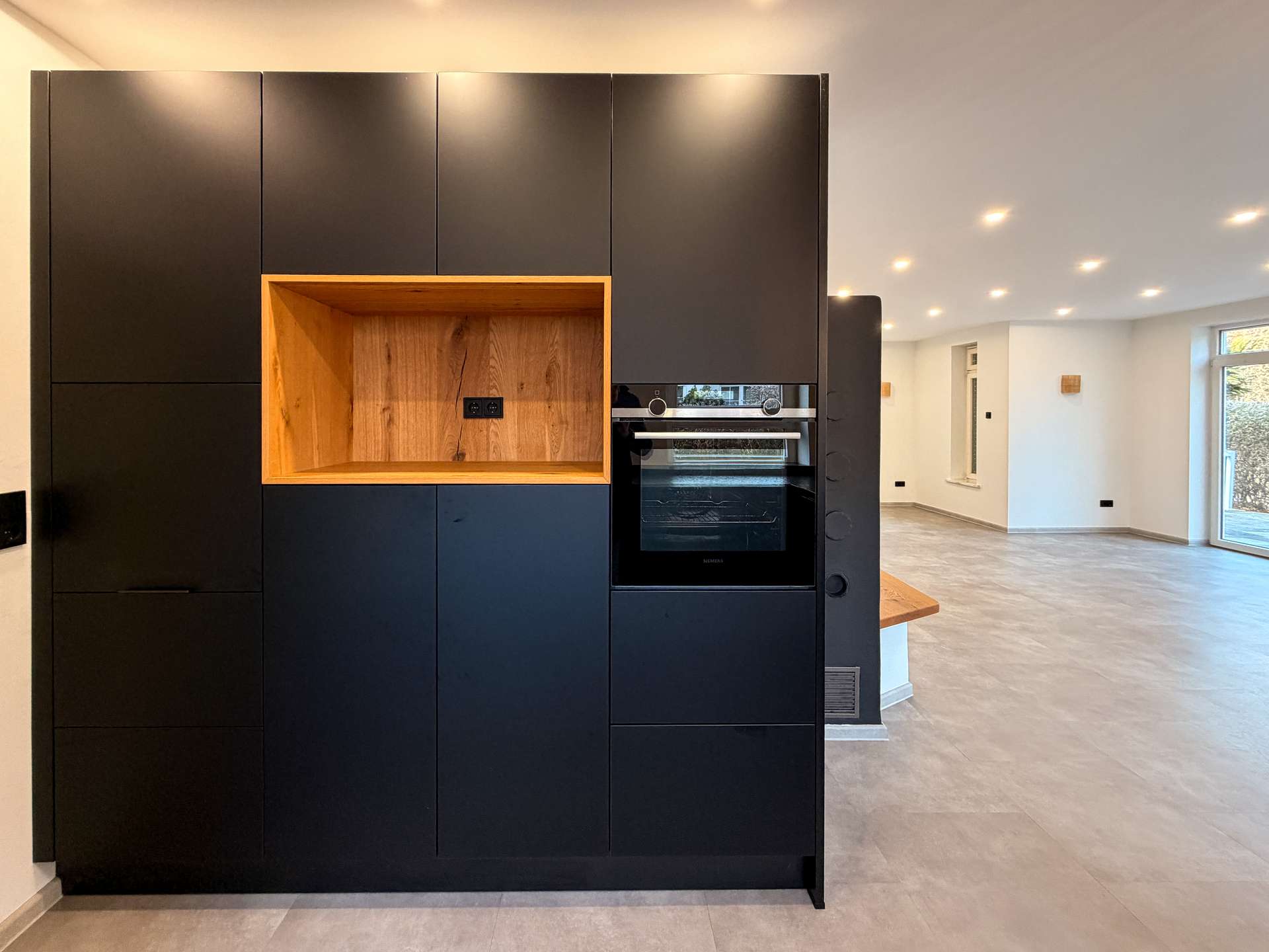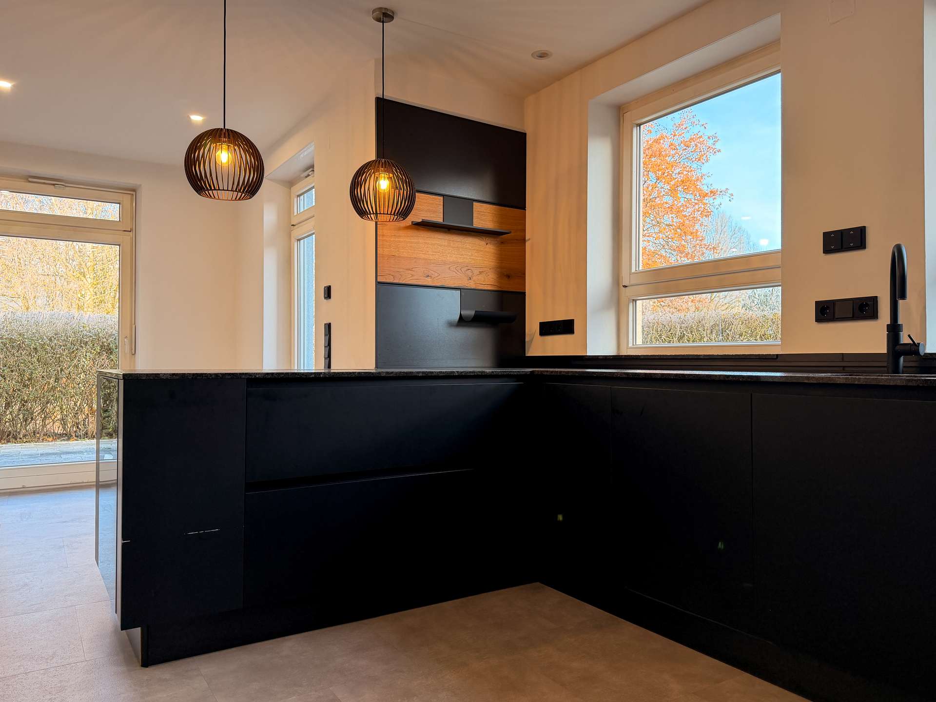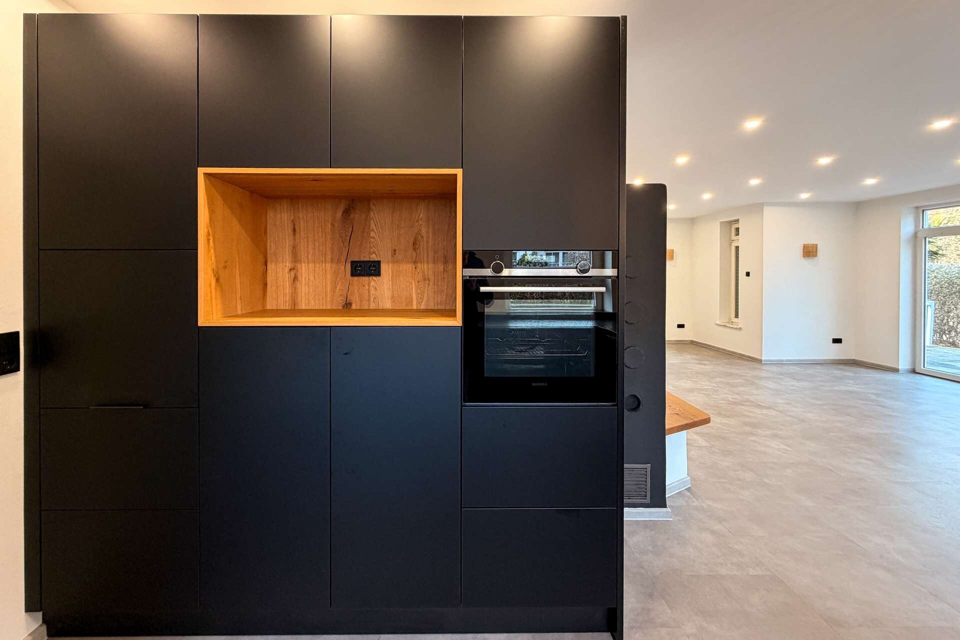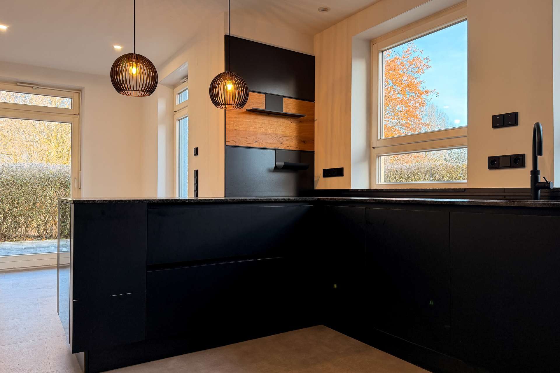 Schon beim Betreten des Hauses fällt der moderne Stil ins Auge. Die 2022 vollständig erneuerte Designküche in edlem Schwarz bildet den Mittelpunkt des Erdgeschosses und überzeugt mit hochwertigem Stil, klaren Linien und einer großzügigen Kochfläche. Dank der angrenzenden Speisekammer sowie dem direkten Zugang zur Garage lässt sich der Alltag besonders komfortabel gestalten.