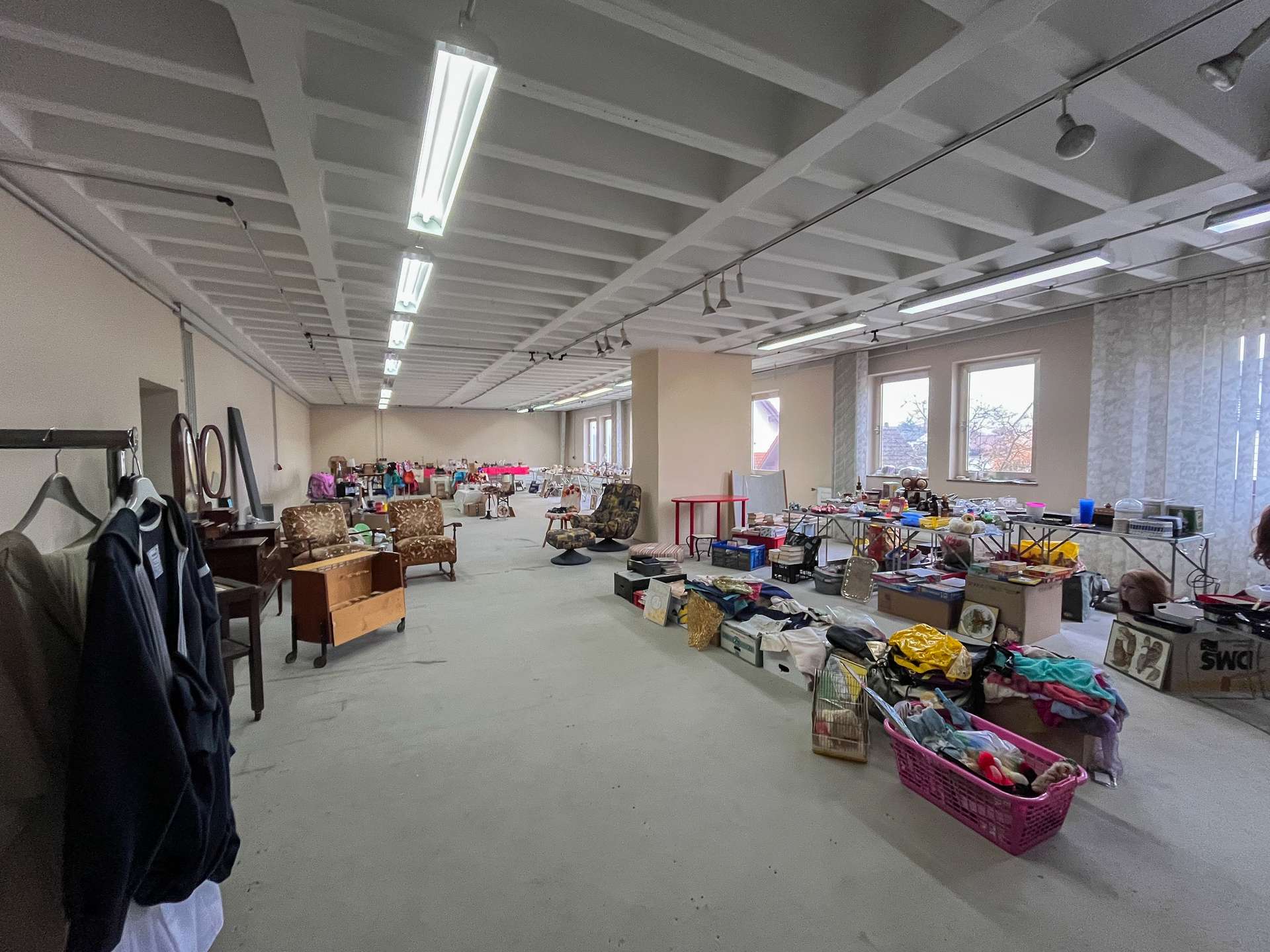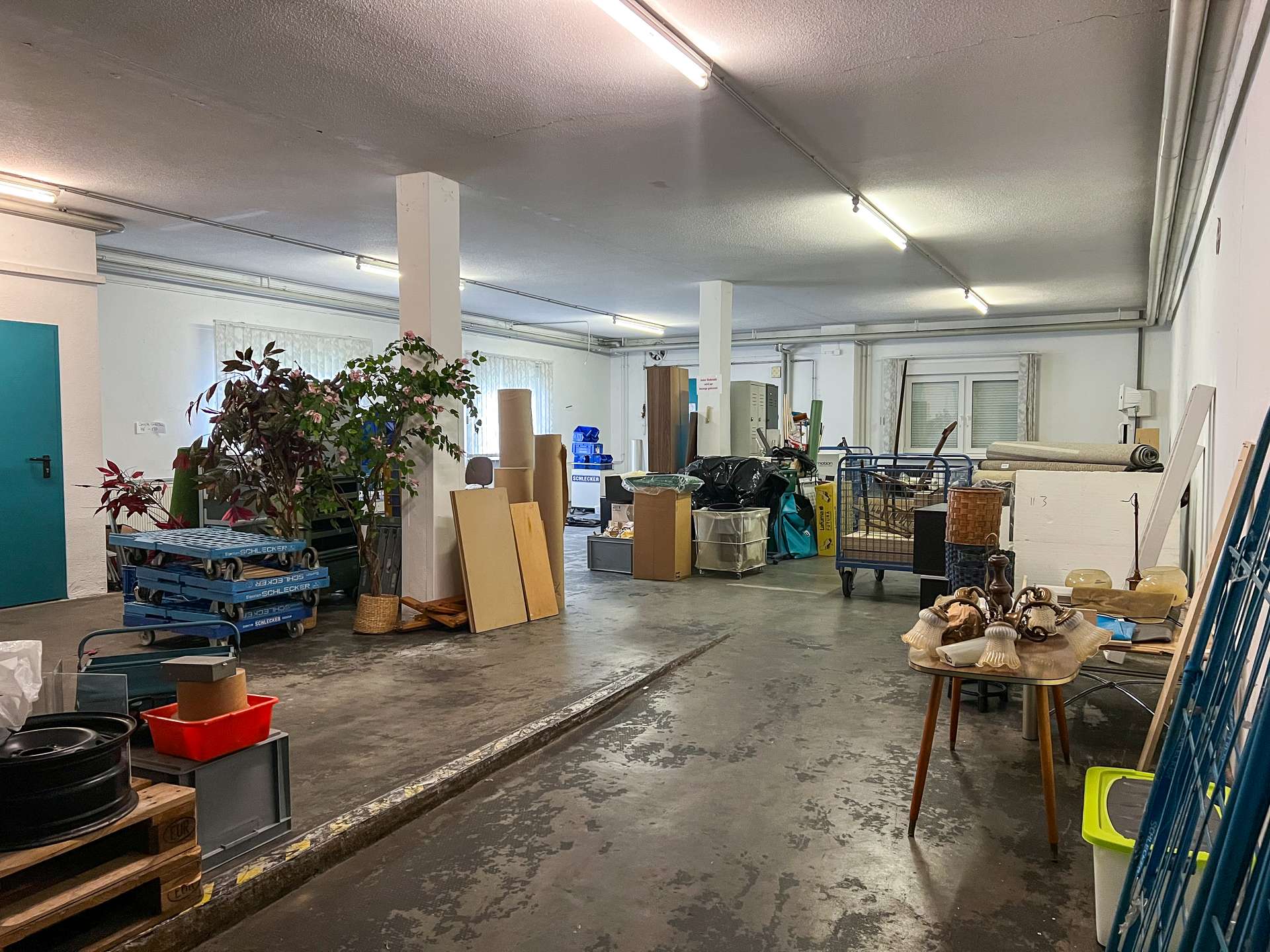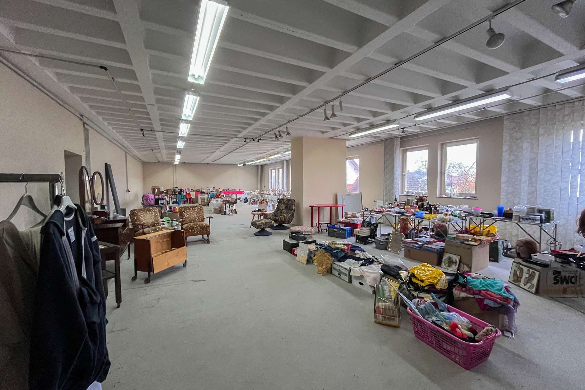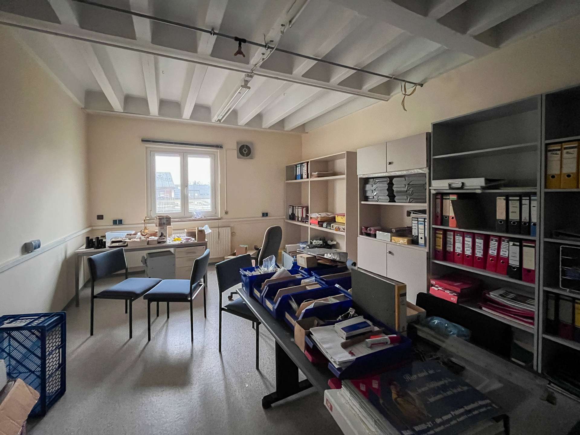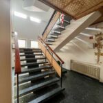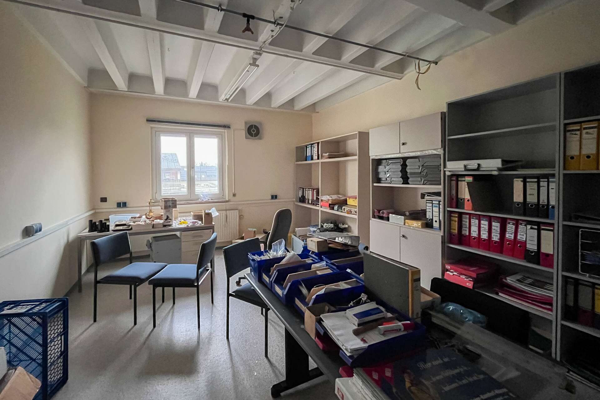Ein Teil des 2. Obergeschosses bietet weitere Gewerbefläche, während der andere Bereich eine ca. 150qm große Wohneinheit umfasst. Die Wohnung verfügt über eine gute Grundstruktur und helle Räume, befindet sich jedoch ebenfalls in einem renovierungsbedürftigen Zustand.