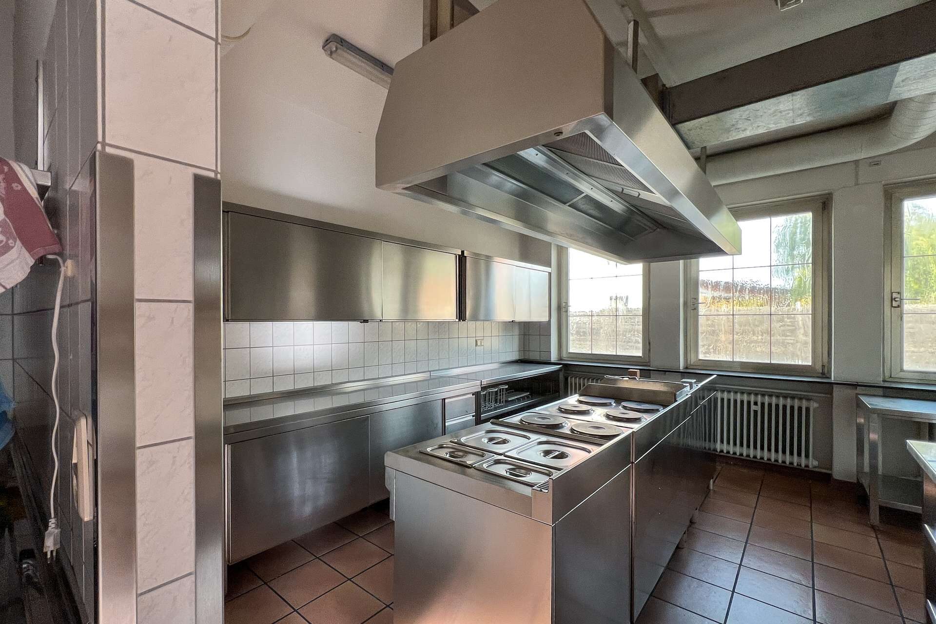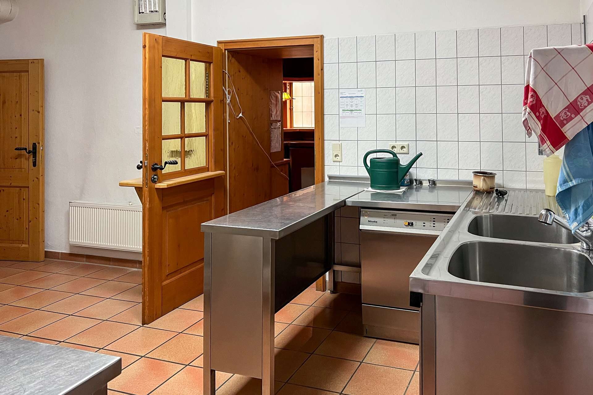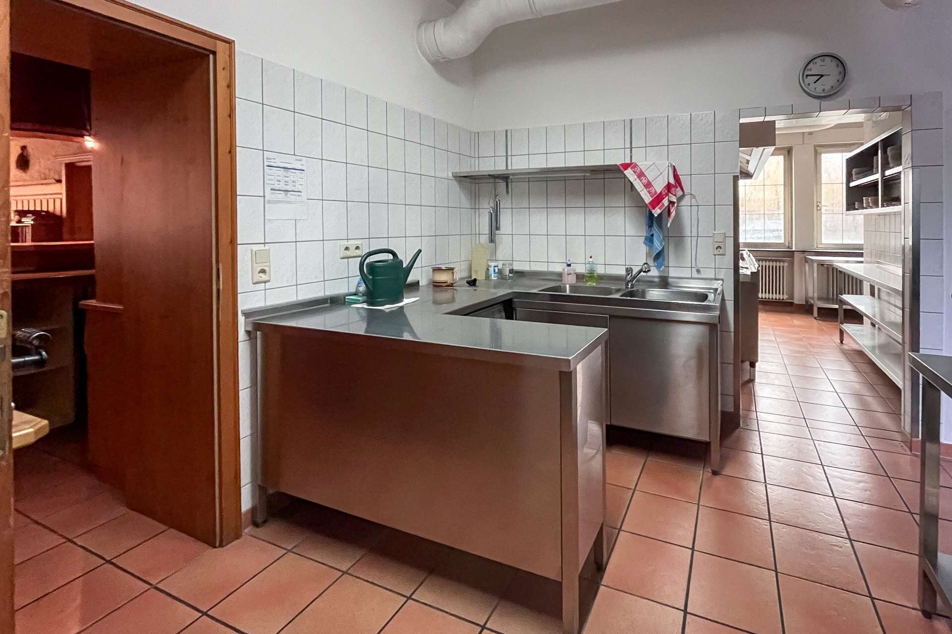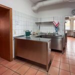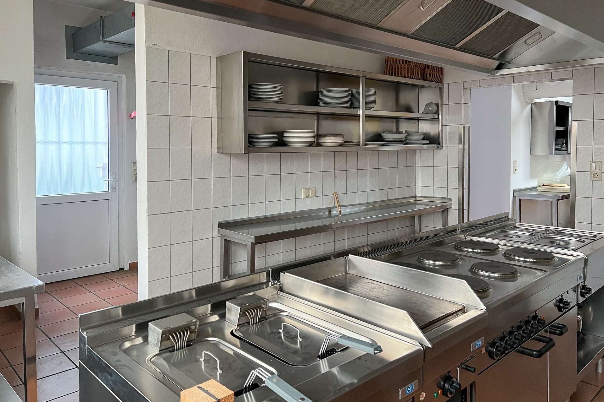 Im Erdgeschoss stehen großzügige Gewerbeflächen zur Verfügung, die sich für unterschiedliche gewerbliche Nutzungen eignen. Ein wesentlicher Bestandteil dieser Ebene ist die umfangreich ausgestattete Industrieküche, die funktional in den gastronomischen Bereich eingebunden ist. Sie verfügt über eine durchdachte Anordnung sowie kurze Wege zur angrenzenden Gastwirtschaft mit Ausschank und Bar, was einen reibungslosen Betriebsablauf ermöglicht. Ein separater Kühlraum sowie weitere Neben- und Arbeitsflächen ergänzen die gastronomische Struktur und schaffen praktische Voraussetzungen für eine Wiederaufnahme oder Neugestaltung des Betriebs.
