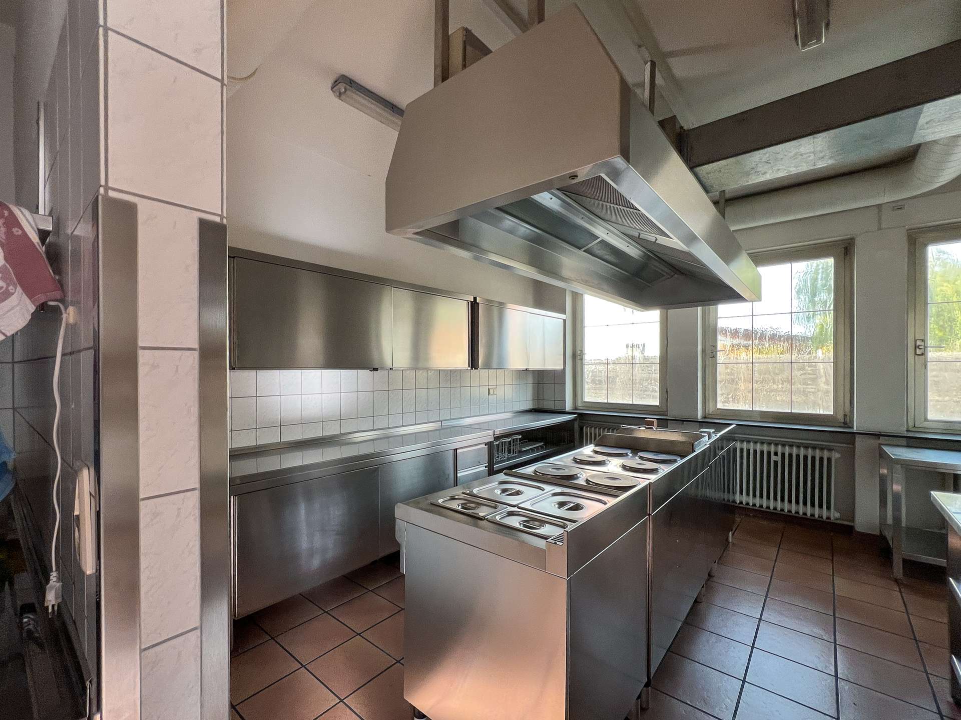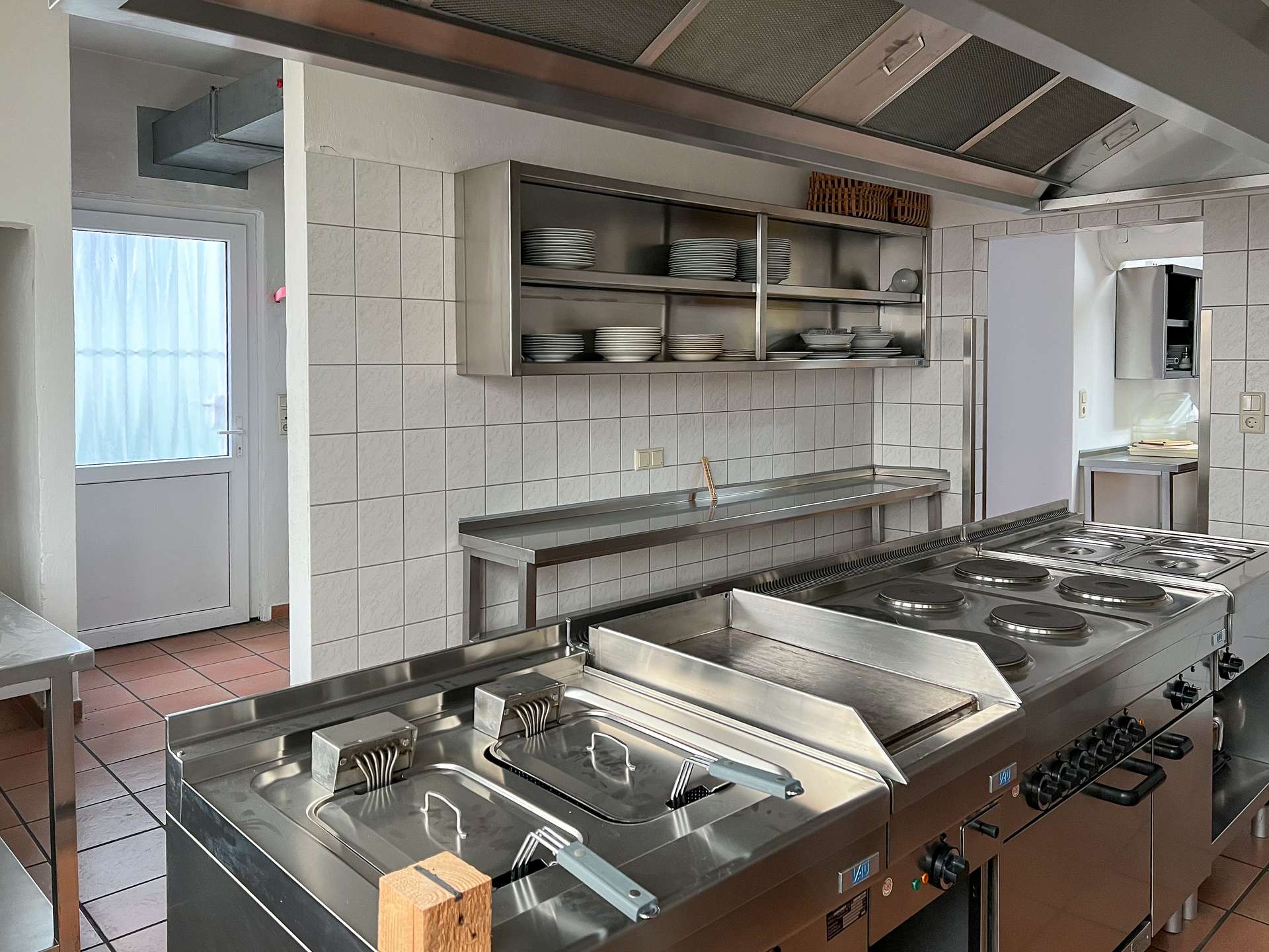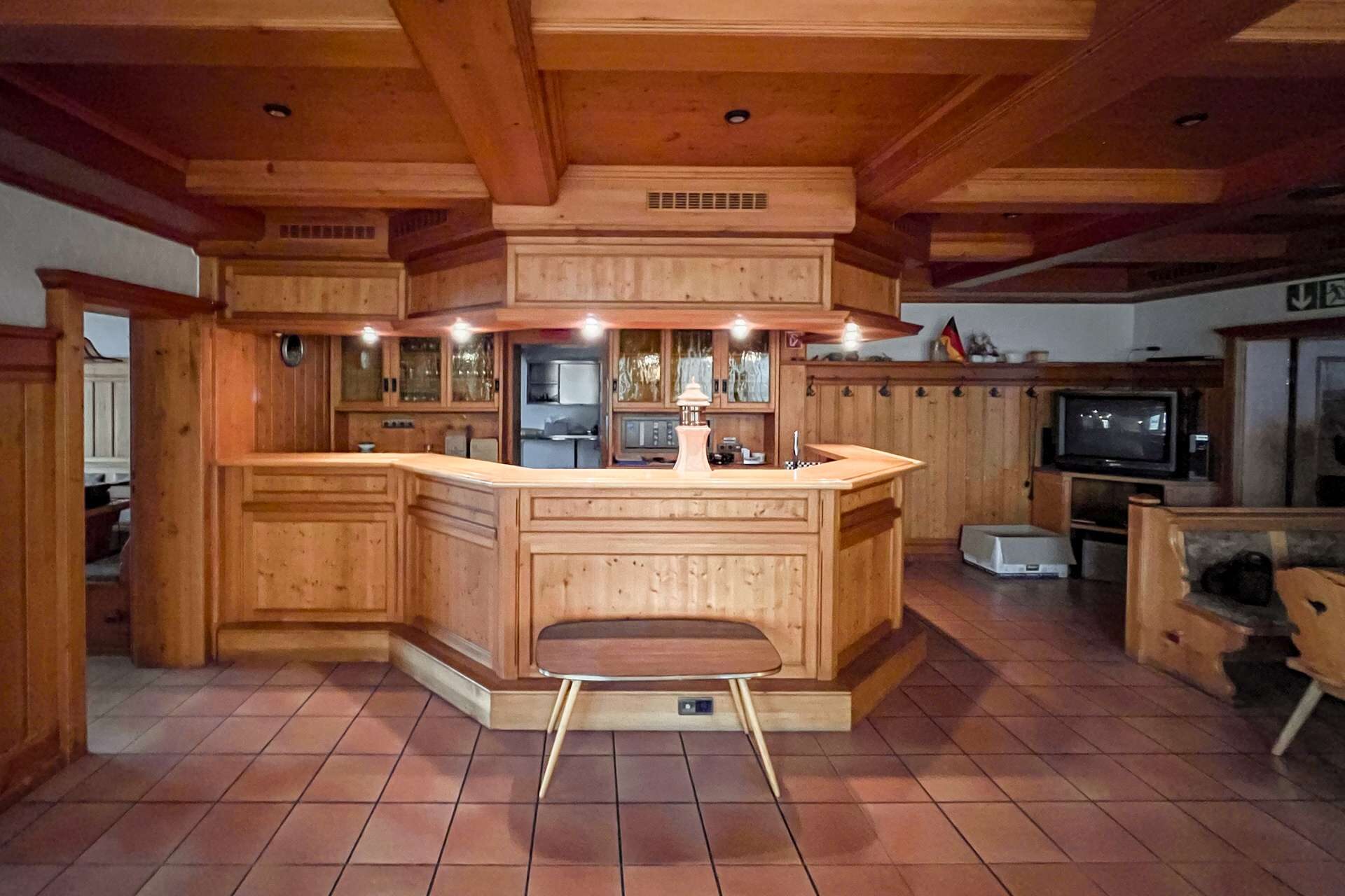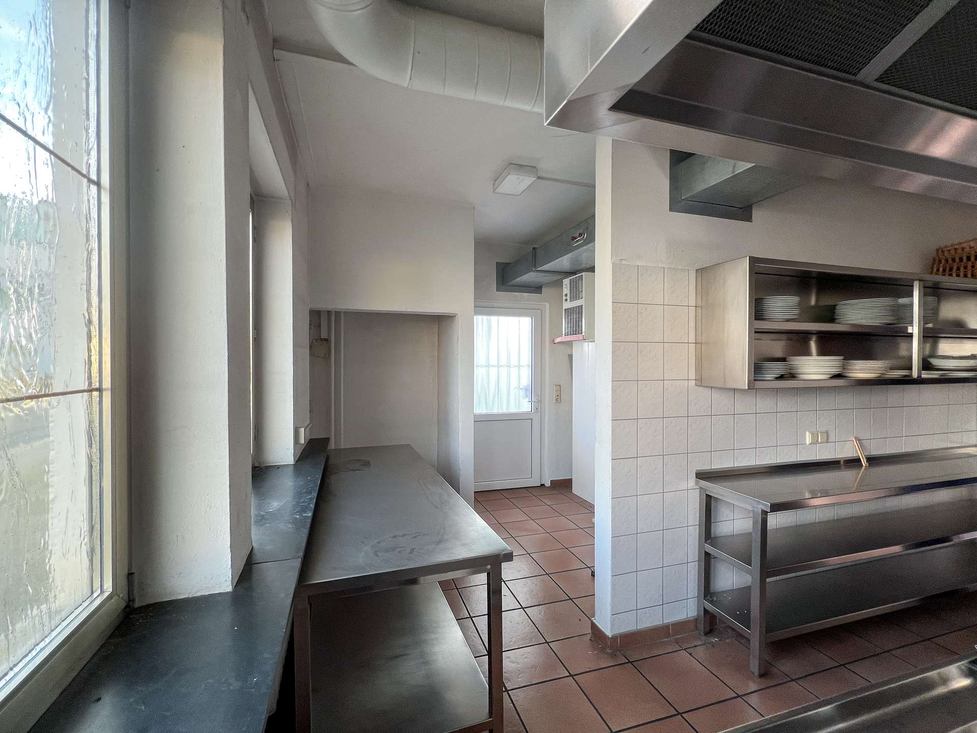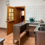 Im Erdgeschoss stehen großzügige Gewerbeflächen zur Verfügung, die sich für unterschiedliche gewerbliche Nutzungen eignen. Ein wesentlicher Bestandteil dieser Ebene ist die umfangreich ausgestattete Industrieküche, die funktional in den gastronomischen Bereich eingebunden ist. Sie verfügt über eine durchdachte Anordnung sowie kurze Wege zur angrenzenden Gastwirtschaft mit Ausschank und Bar, was einen reibungslosen Betriebsablauf ermöglicht. Ein separater Kühlraum sowie weitere Neben- und Arbeitsflächen ergänzen die gastronomische Struktur und schaffen praktische Voraussetzungen für eine Wiederaufnahme oder Neugestaltung des Betriebs.
