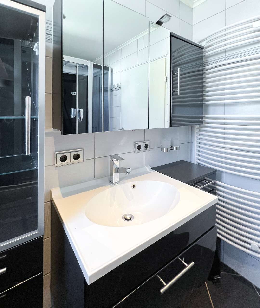 Hochwertige Bodenbeläge aus Fliesen, Parkett und Laminat sorgen in allen Räumen für eine angenehme Wohnatmosphäre. Der zur Wohnung gehörende Kelleranteil schafft zusätzlichen Stauraum, während Garage und Außenstellplätze die Parkmöglichkeiten abrunden.