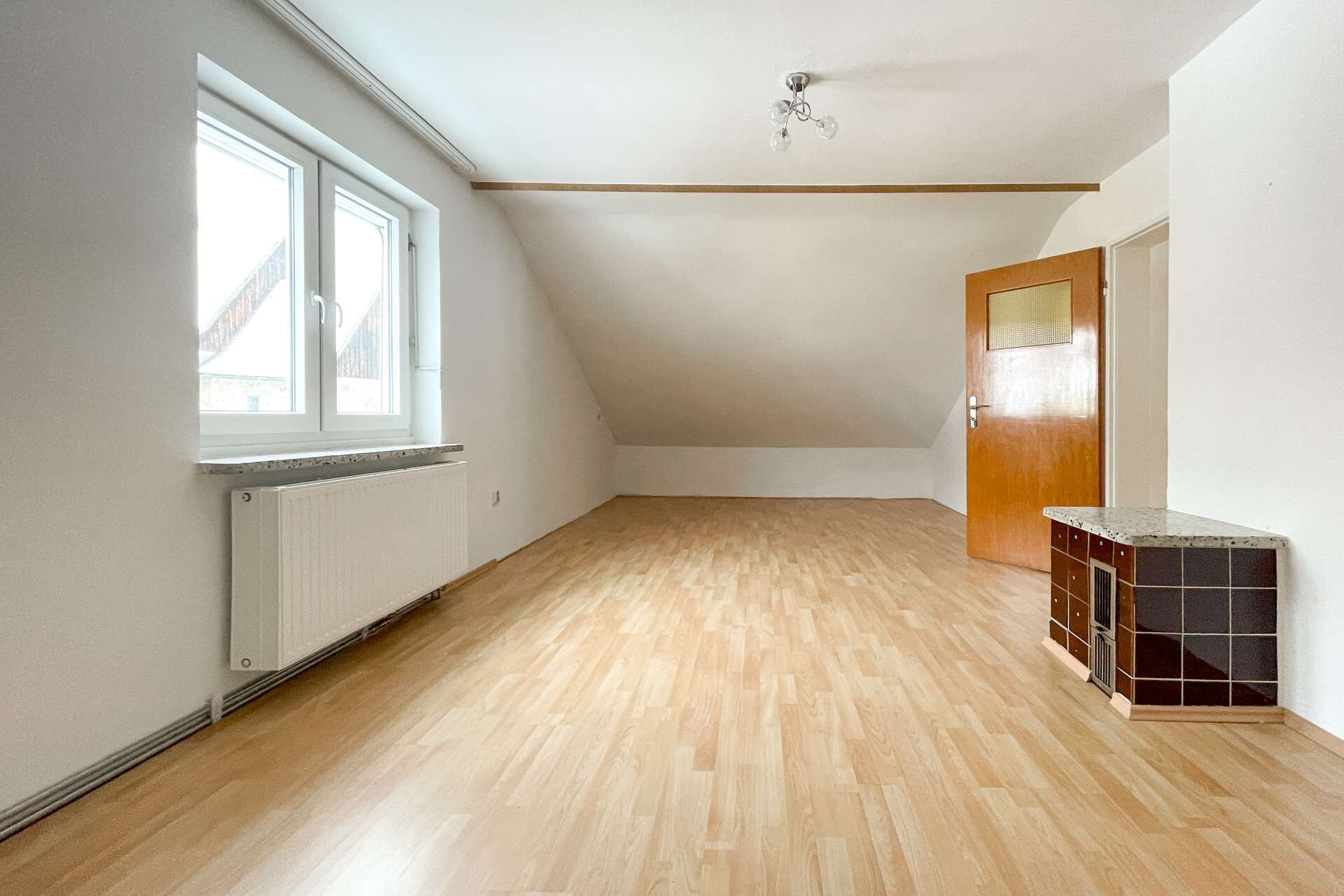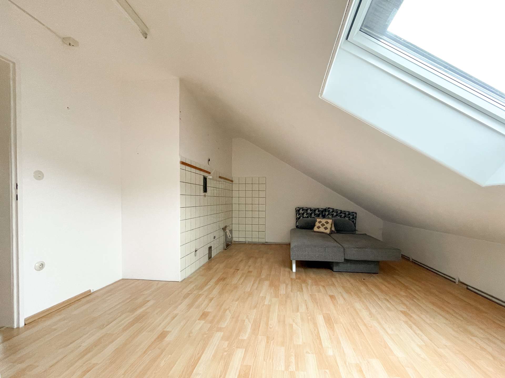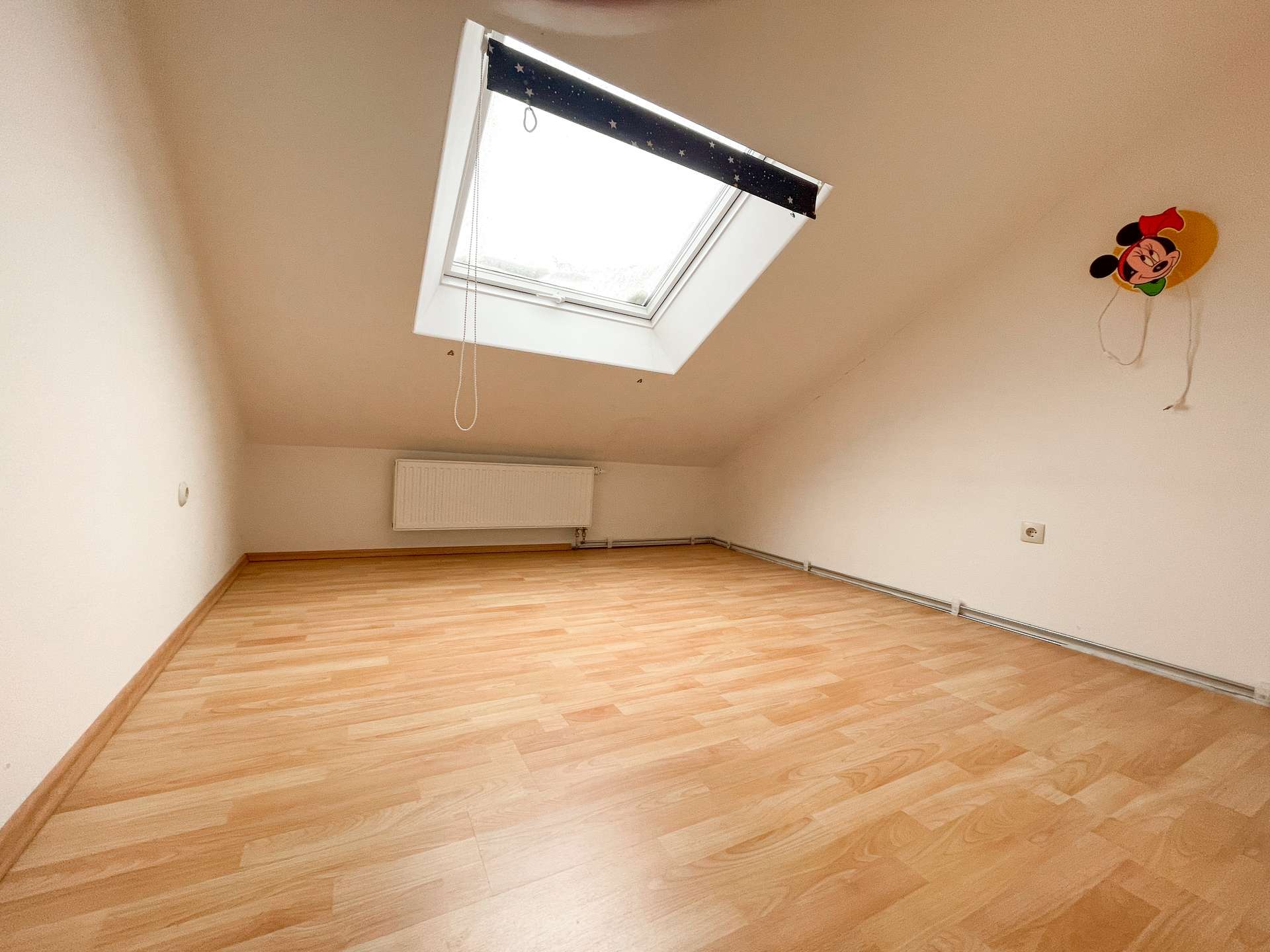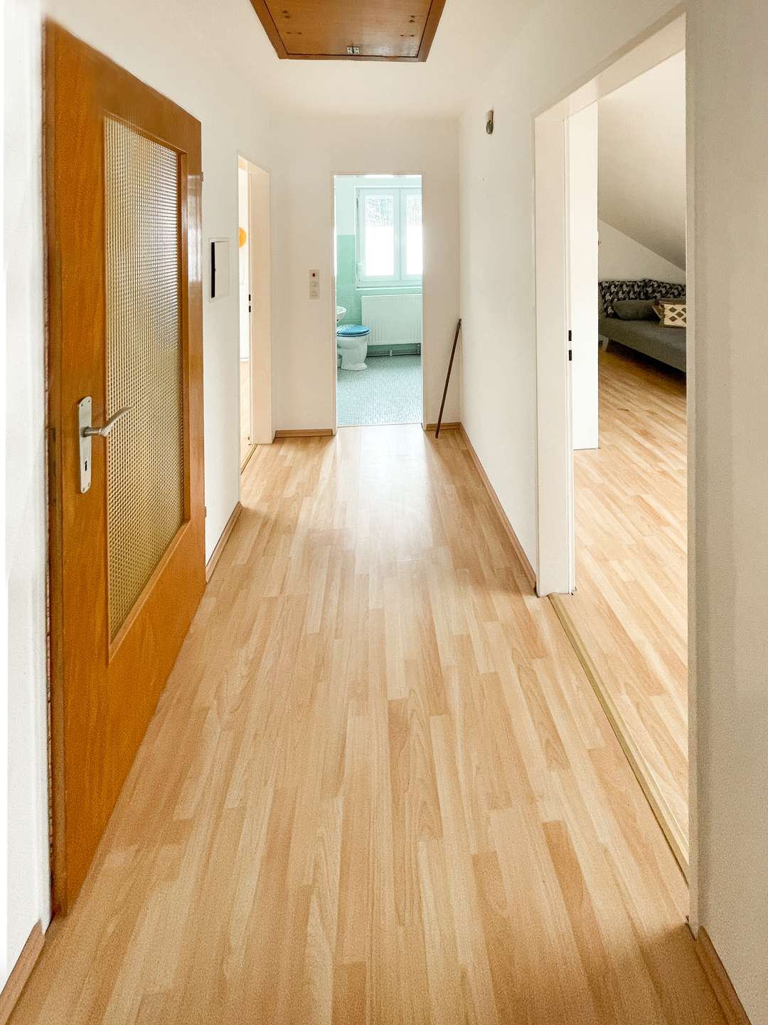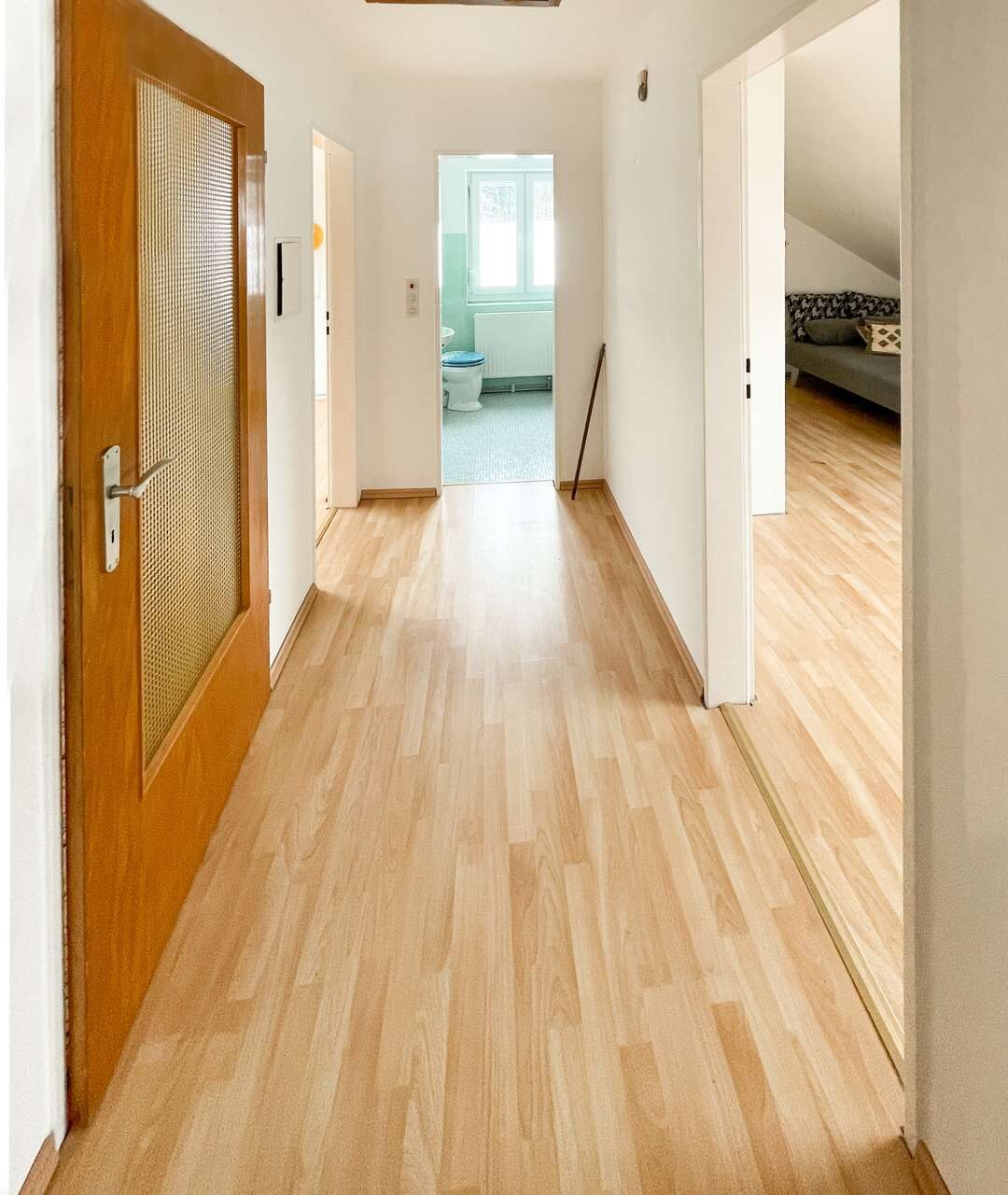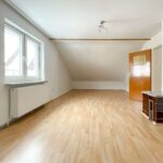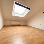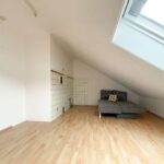 Im Dachgeschoss befindet sich die zweite Wohneinheit. Diese verfügt über eine große Wohnküche und zwei Schlafzimmer, sowie ein Badezimmer mit Tageslicht und Badewanne. Durch die großen Fenster ist diese Etage trotz der Dachschrägen lichtdurchflutet und hell.